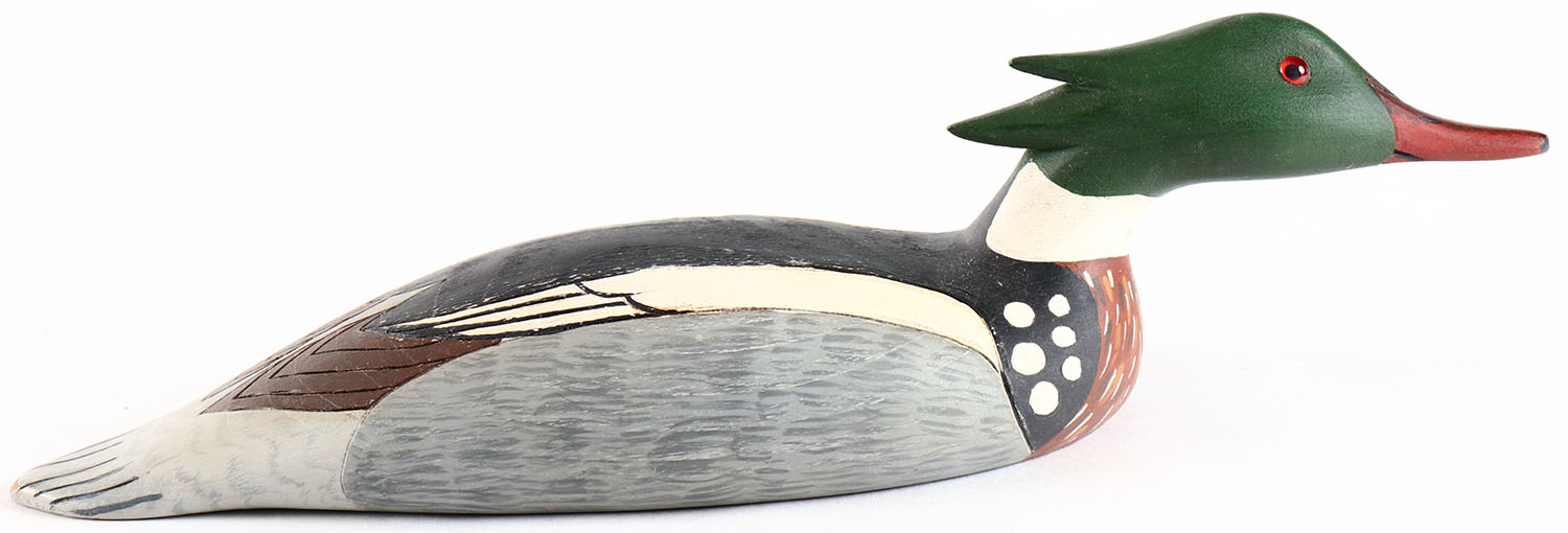 Swimming Red Breasted Merganser by C.J. Soine, glass eyes, solid wood, original paint, structurally excellent, branded on bottom. Grade: Excellent + - Value: 10 to 60