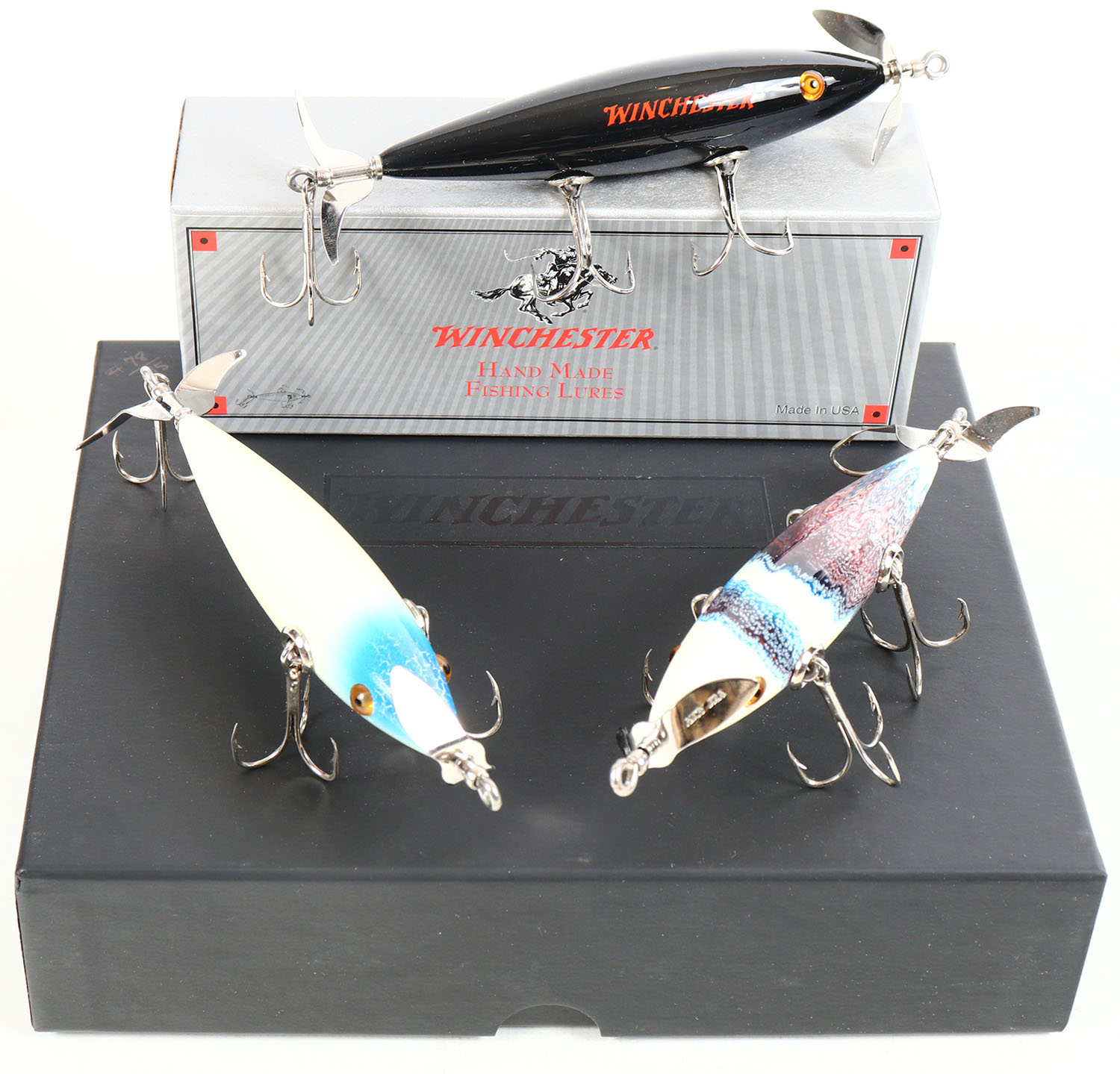 Case of Winchester 5 hook lures, all numbered 78/195, boxes are marked SPECIAL Blue Crackle 9211, Black 9212 & Victory Marble 9210, has paperwork, black case box is 7 1/2'' x 6 1/4'', all are mint. Grade: MINT - Value: 100 to 500