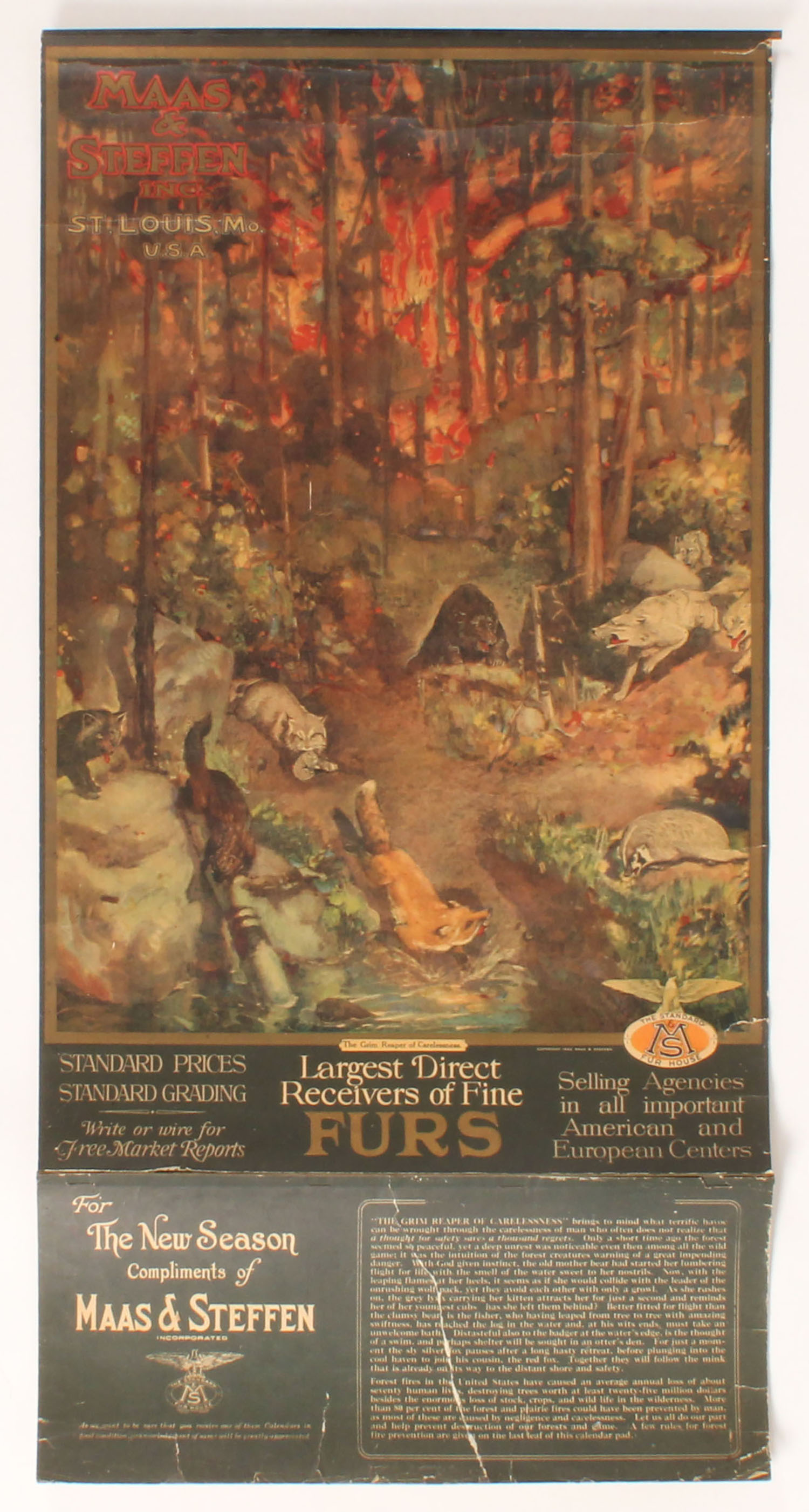 Mass & Steffen 1929 Calendar, ''THE GRIM REAPER OF CARELESSNESS'', pictures bears, wolves, red fox, badger, wolverine, bobcat & more, 13 1/2'' x 27 1/4'', has original band with brass hanger, shows some edge wear with light roll wrinkles to top only, kind of a dark image, Full Pad of Pages, has nice color with dramatic image, only one we have seen. Grade: Excellent - Value: 800 to 2000