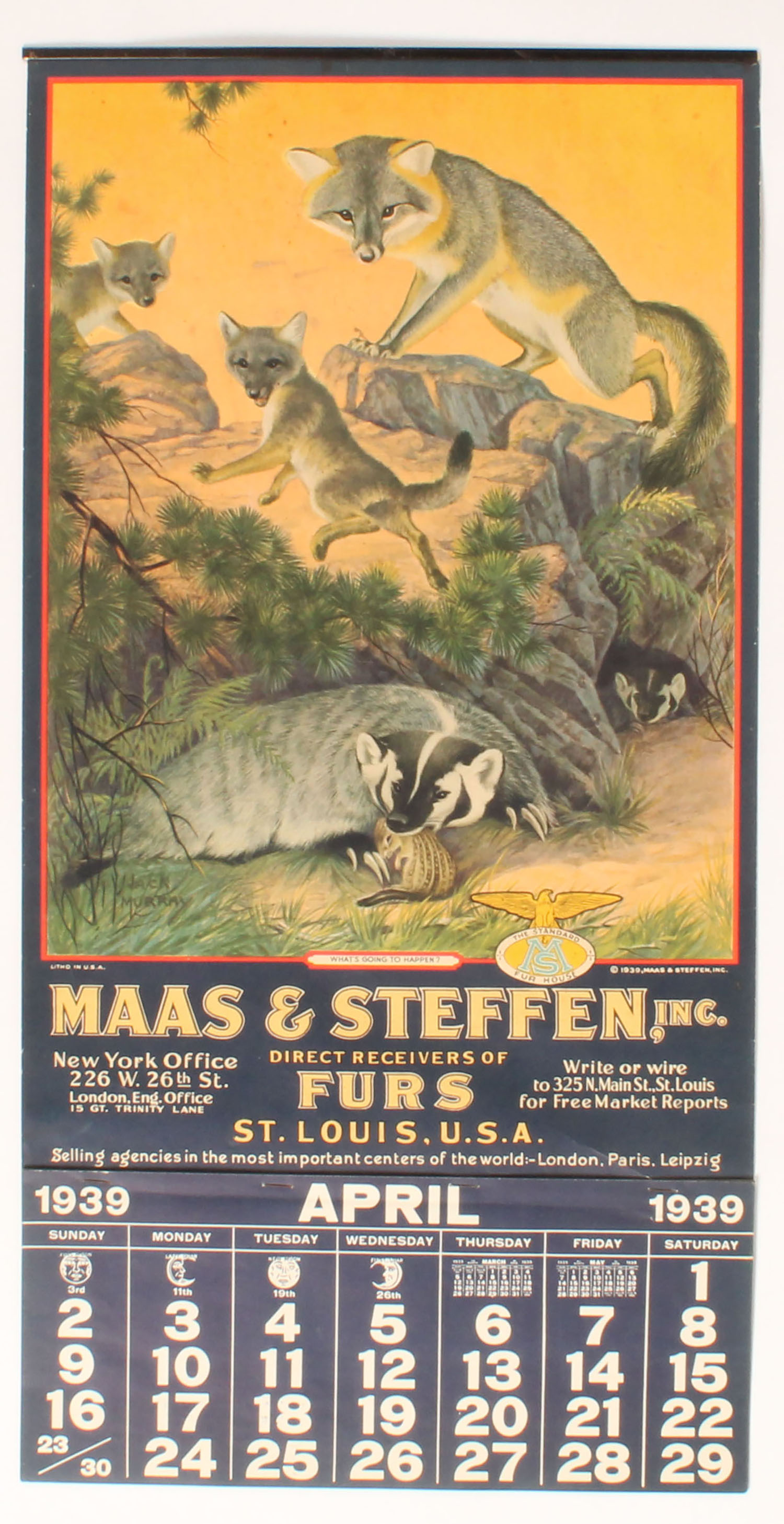 Mass & Steffen 1939 Calendar, ''WHAT'S GOING TO HAPPEN?'', pictures badger holding a baby chipmunk with fox family looking on, 13 1/2'' x 26 1/2'', has original band with no brass hanger, appears near mint with a few very small spots to top, April-Dec. Pages, has great color with beautiful image. Grade: Excellent ++ - Value: 400 to 1500