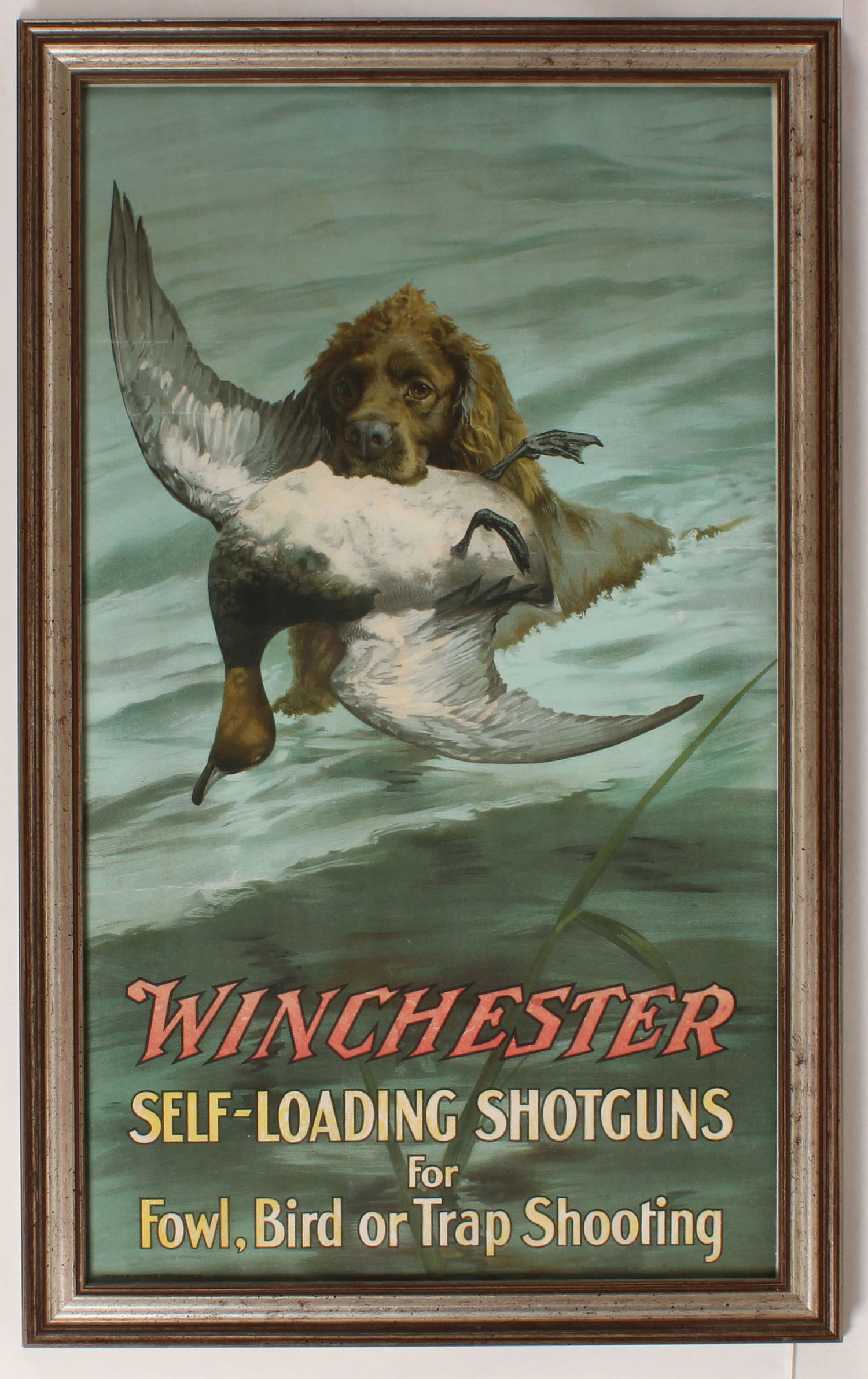 Winchester Poster ''WINCHESTER SELF-LOADING SHOTGUNS FOR FOWL, BIRD OR TRAP SHOOTING'', has full color image of Irish setter retrieving a canvasback in water, has metal bands top & bottom with brass hanger, shows light fading to color, has a few light creases to right side, framed. Grade: Very Good ++ - Value: 1000 to 3000