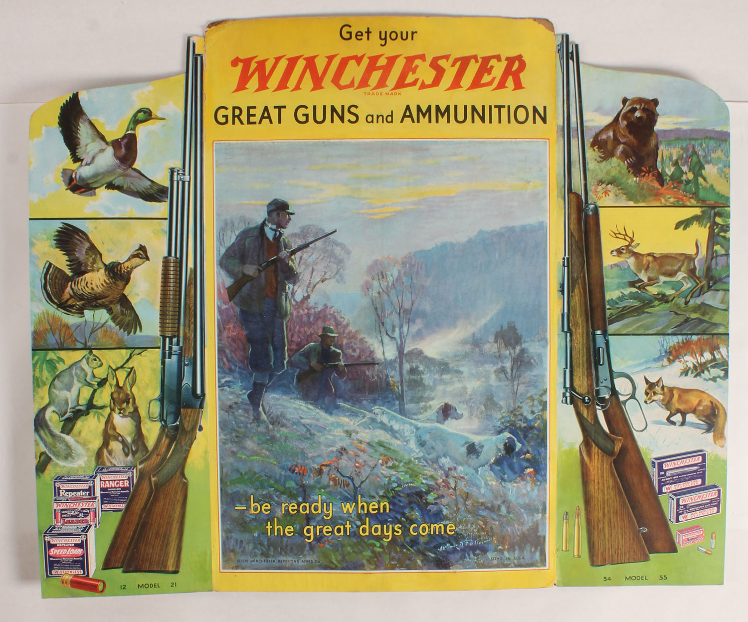 Winchester Tri Fold Counter Diecut, pictures fall upland hunting scene, with many game animals, ammo boxes & guns, ''GET YOUR WINCHESTER GREAT GUN ANS AMMUNITION HERE'', has some areas of professional touch ups through out, Models 12, 21, 54 & 55 are pictured, 38'' x 31 1/4'', Only one we have seen. Grade: Excellent - Value: 1000 to 4000