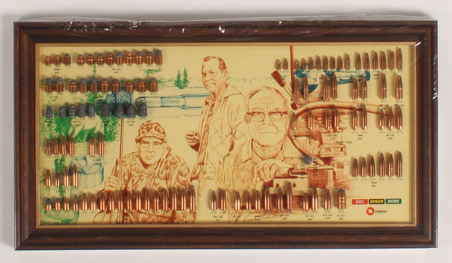 Speer Bullet Board, pictures founders Vernon Speer, Fred Huntington & Richard Speer, all bullets intact, 21 1/2'' wide. Has original wrapping. Grade: MINT - Value: 100 to 300