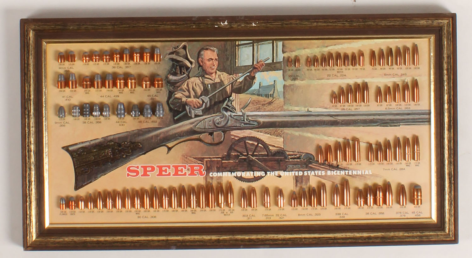Speer Bullet Board, pictures Pennsylvania Kentucky Rifle being cleaned by frontiersman, all bullets intact. Grade: Excellent + - Value: 100 to 300