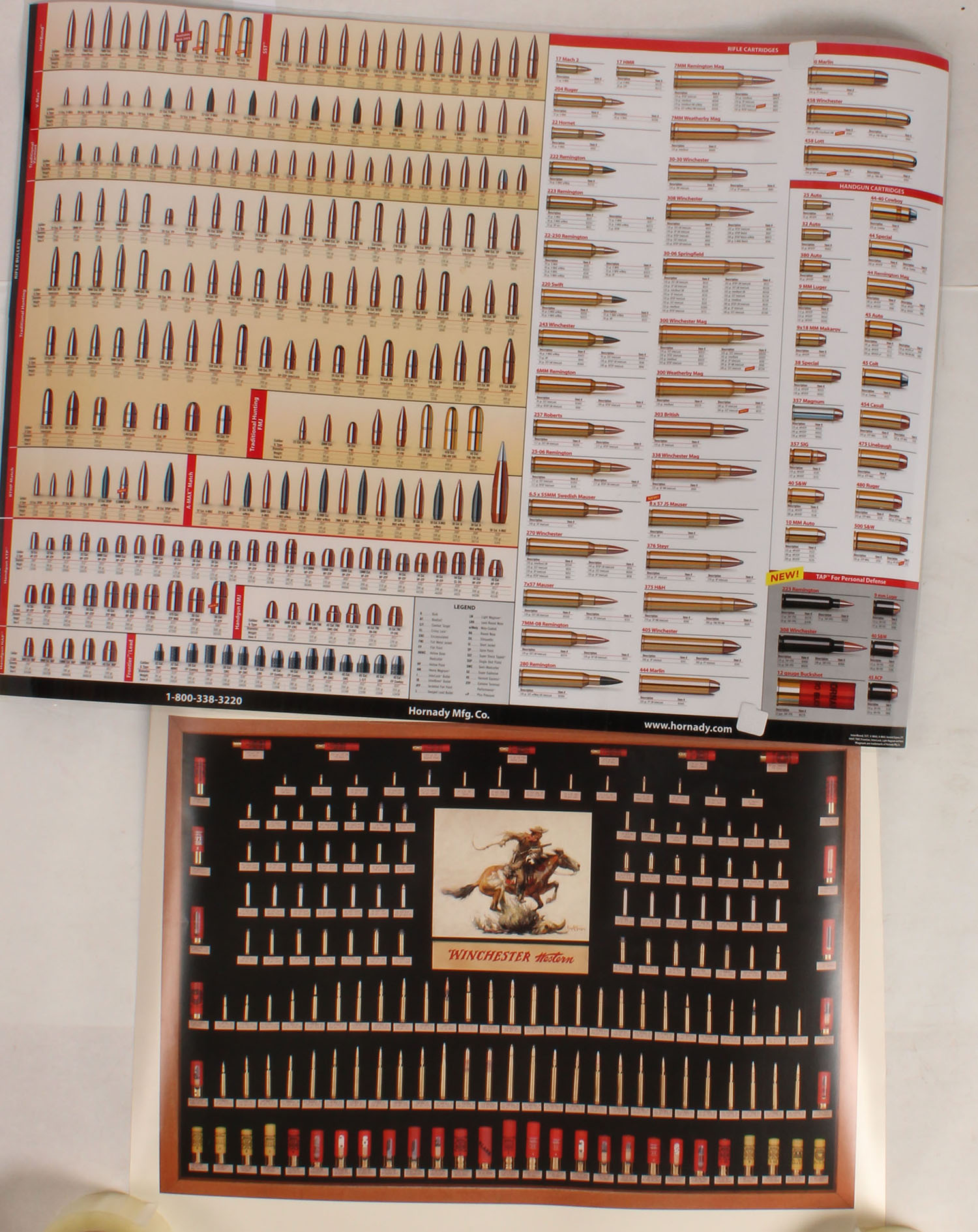 Lot of 2 ammo charts, Hornaday 30 1/2'' x 22 1/2'' & Winchester 24'', x 18''. Grade: Excellent - Value: 6 to 30