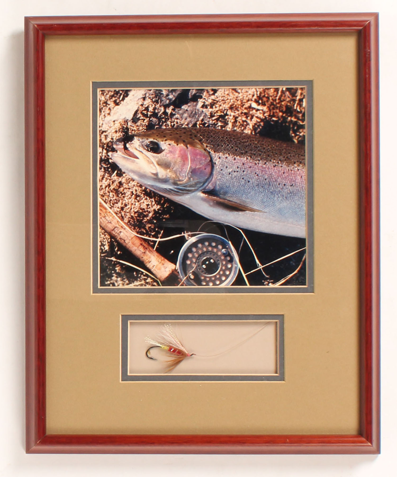 1989 photo of a North Umpqua Steelhead from Oregon on a Umpqua Special Steelhead fly with a fly in a shadow box, framed. Grade: Excellent - Value: 10 to 50