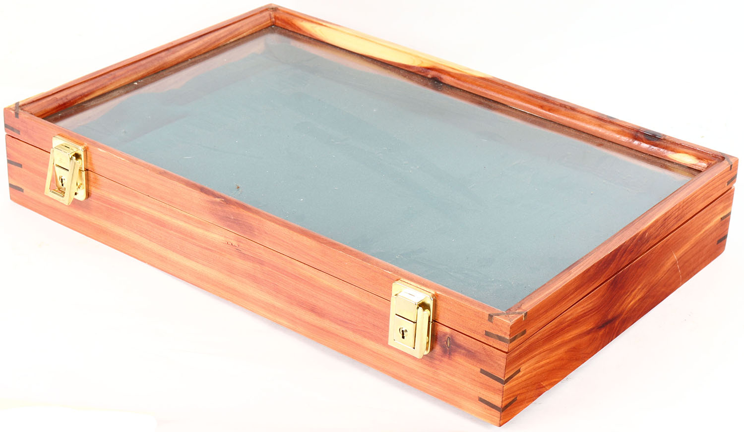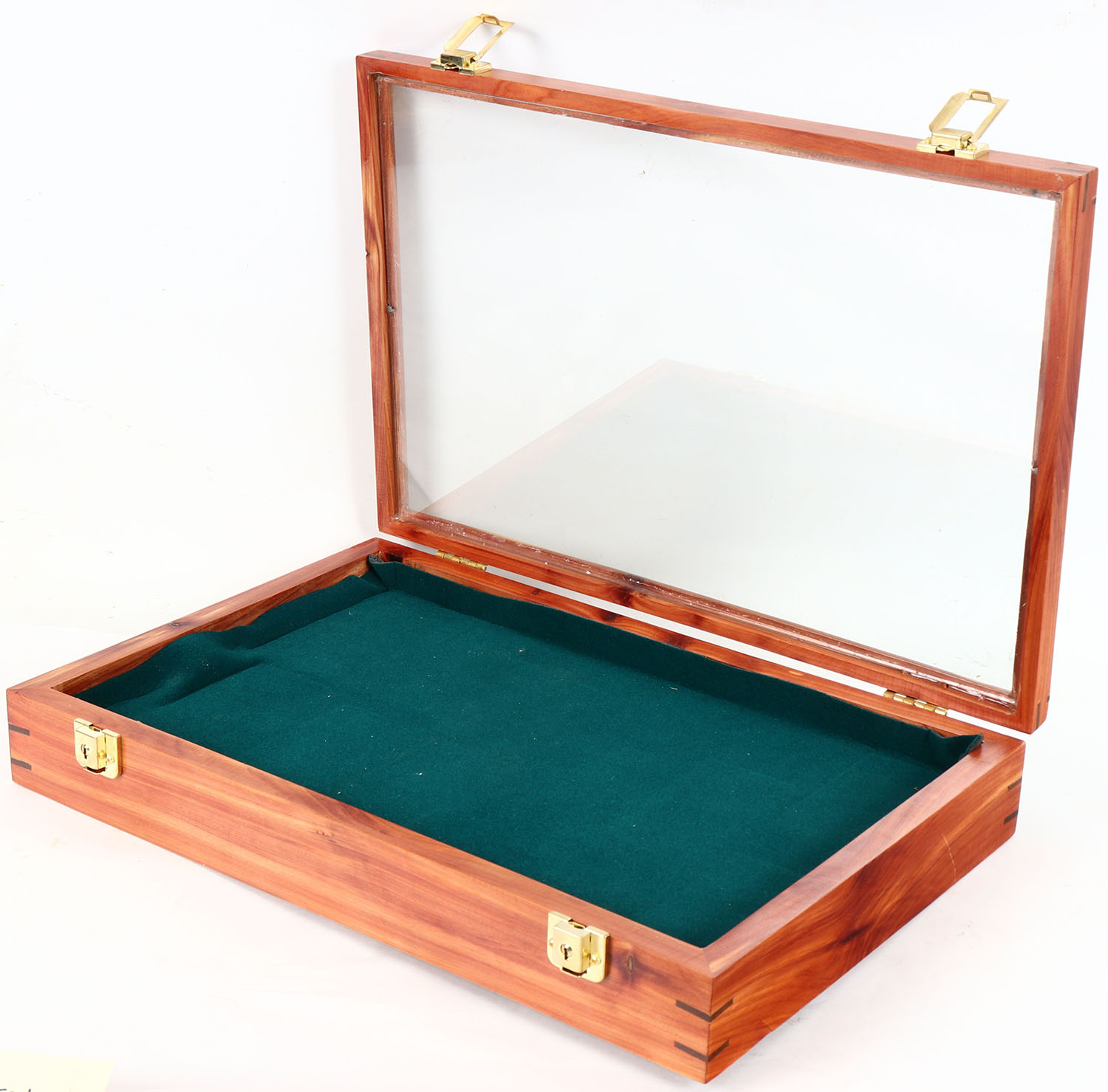 Wood display case, felt liner, 18'' x 12'' x 3 1/2''. Grade: Excellent ++ - Value: 40 to 400