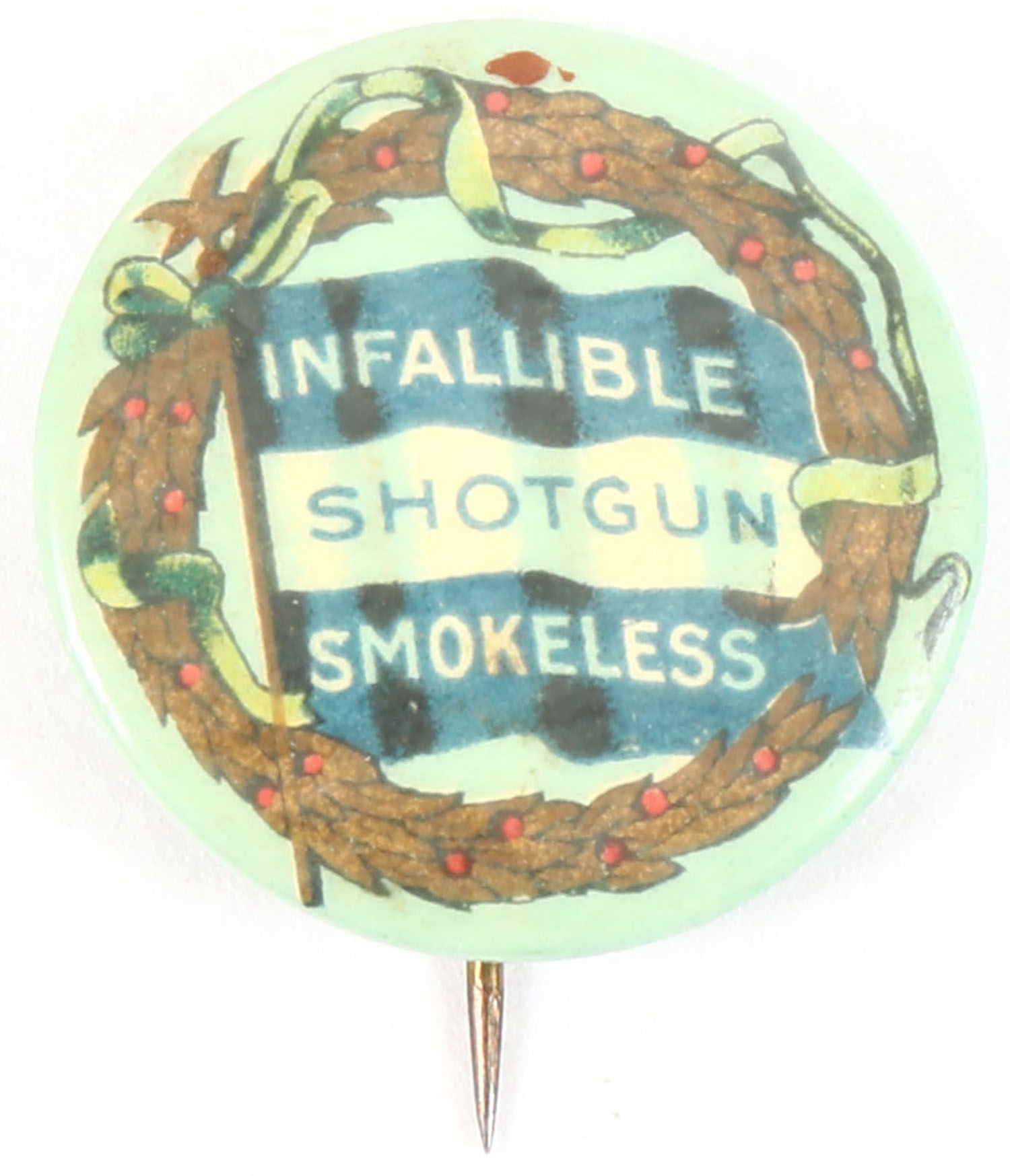 Dupont pinback, infallible shotgun smokeless, Dupont powder paperback. Grade: Very Good ++ - Value: 10 to 50