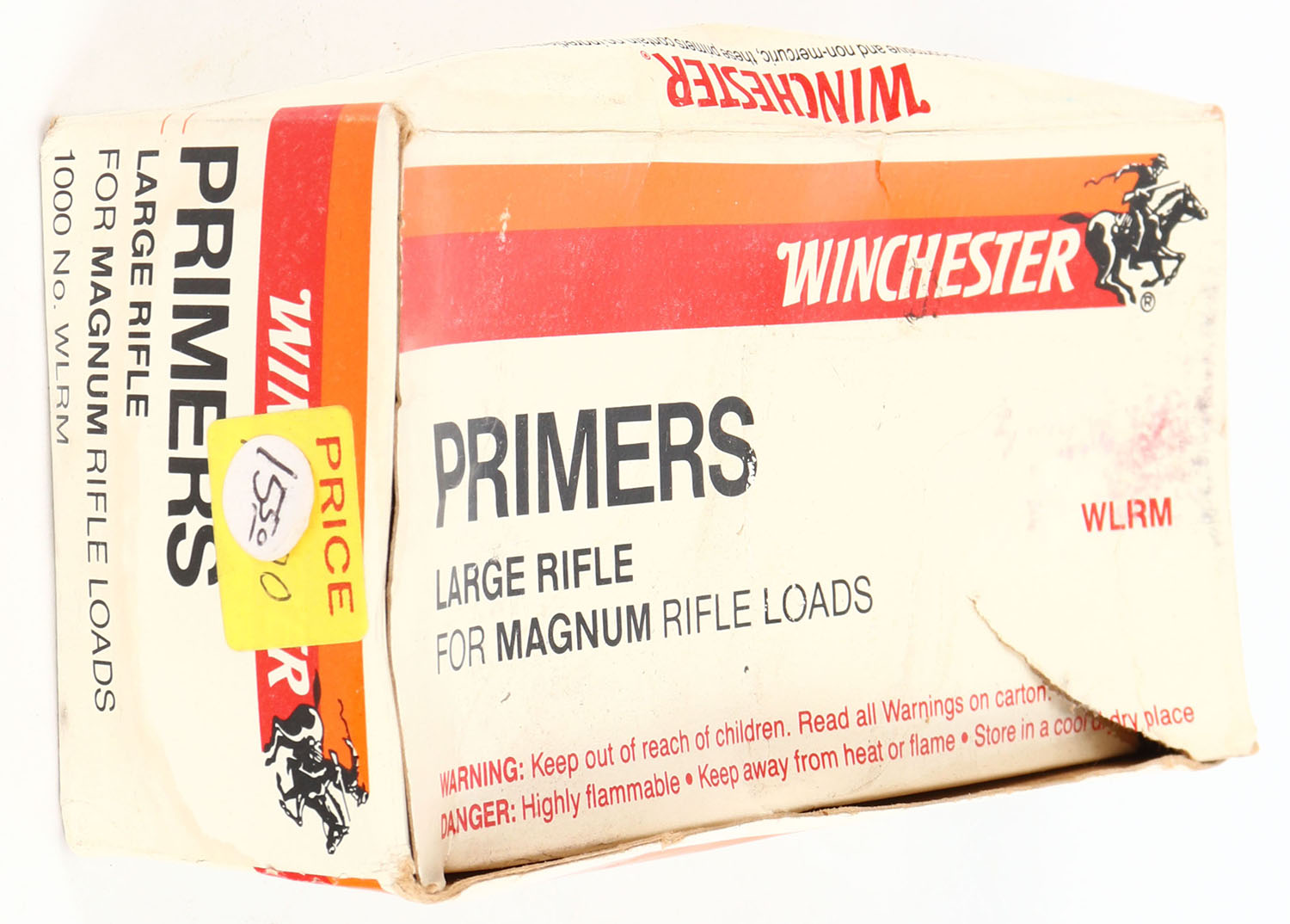 Winchester Large rifle primers, MAGNUM, FULL, outside box is weak inside is mint, 1000 primer brick. Grade: Very Good ++ - Value: 30 to 90