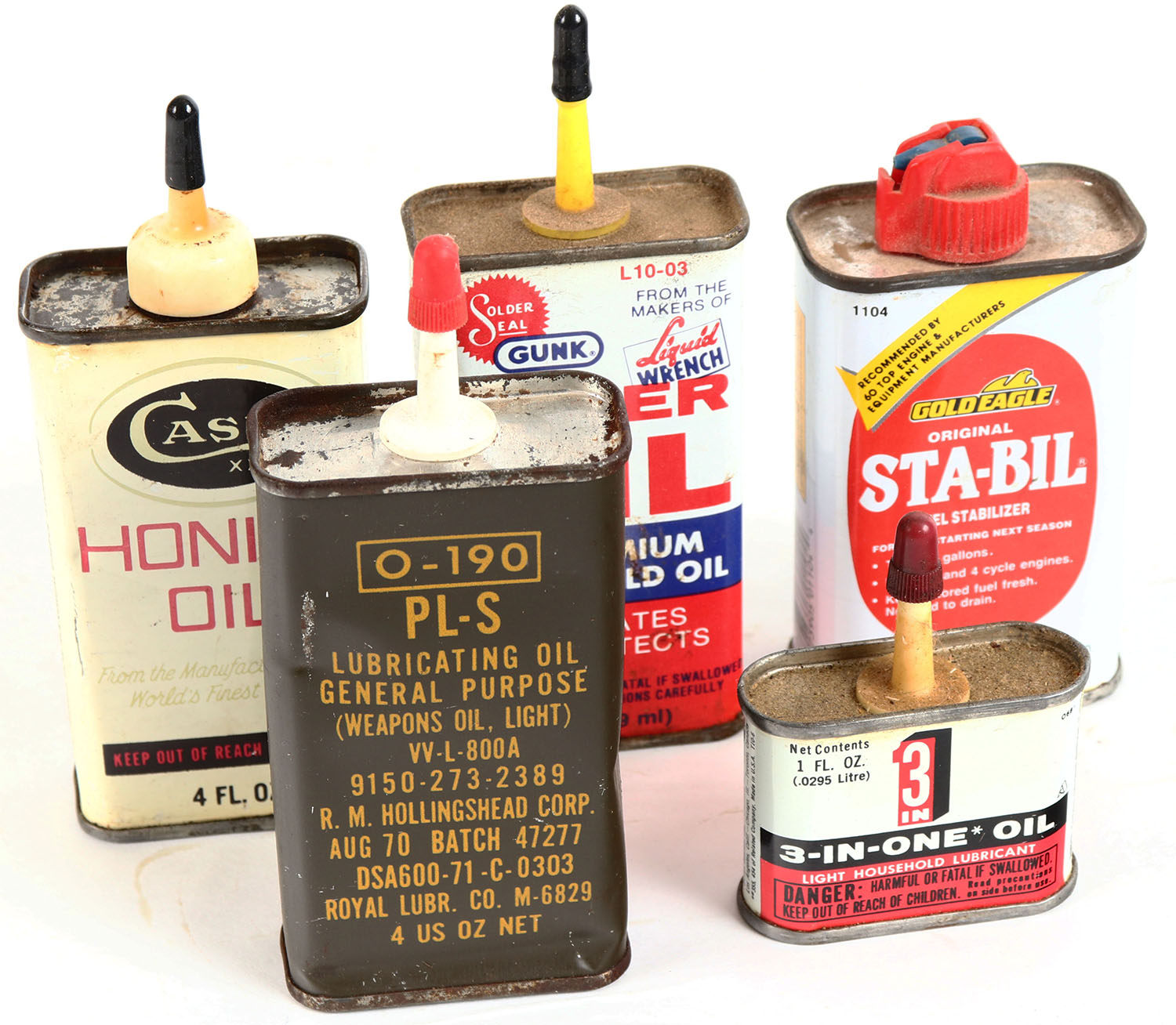 Lot of 5, oil tins, partial, some age soiling. Grade: Very Good ++ - Value: 4 to 40