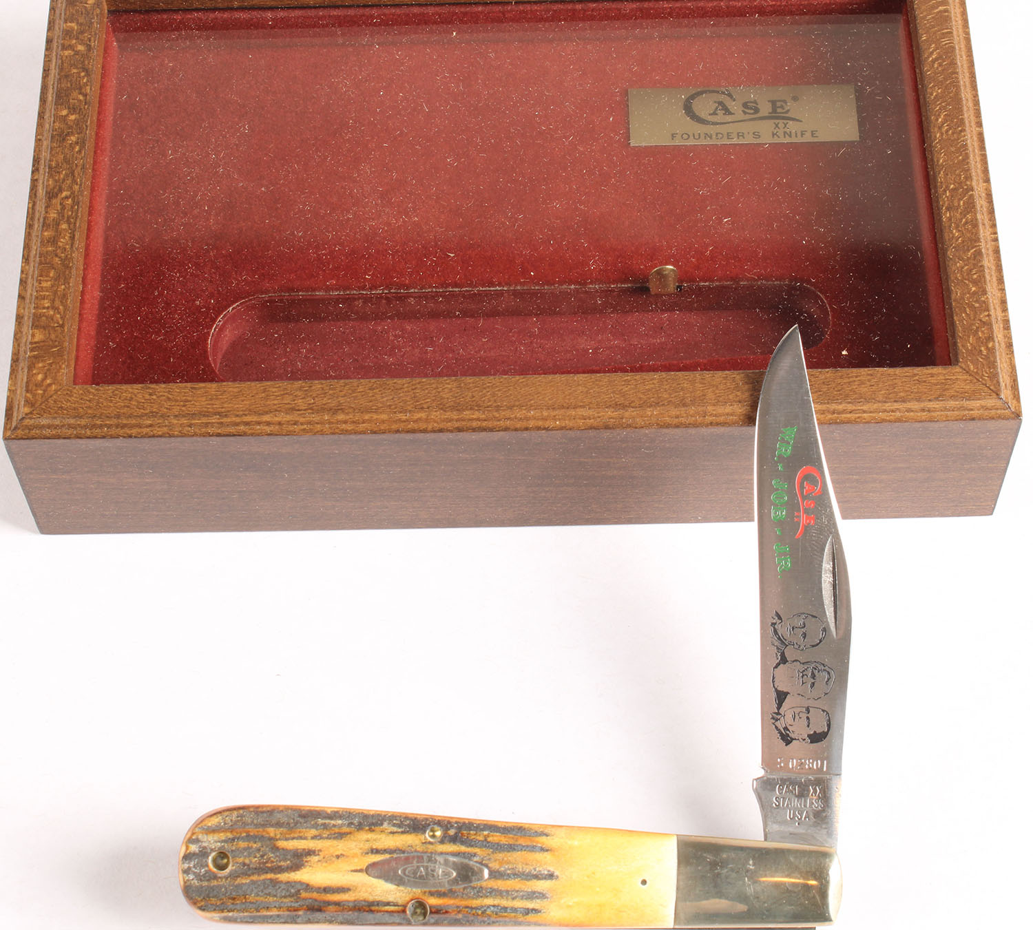 Rare! Case founders knife, S 02801, #5143 SSP, folding single blade knife, 4'' blade, stag handle, has wood and glass display box and cardboard shipping box. Grade: Excellent ++ - Value: 50 to 200