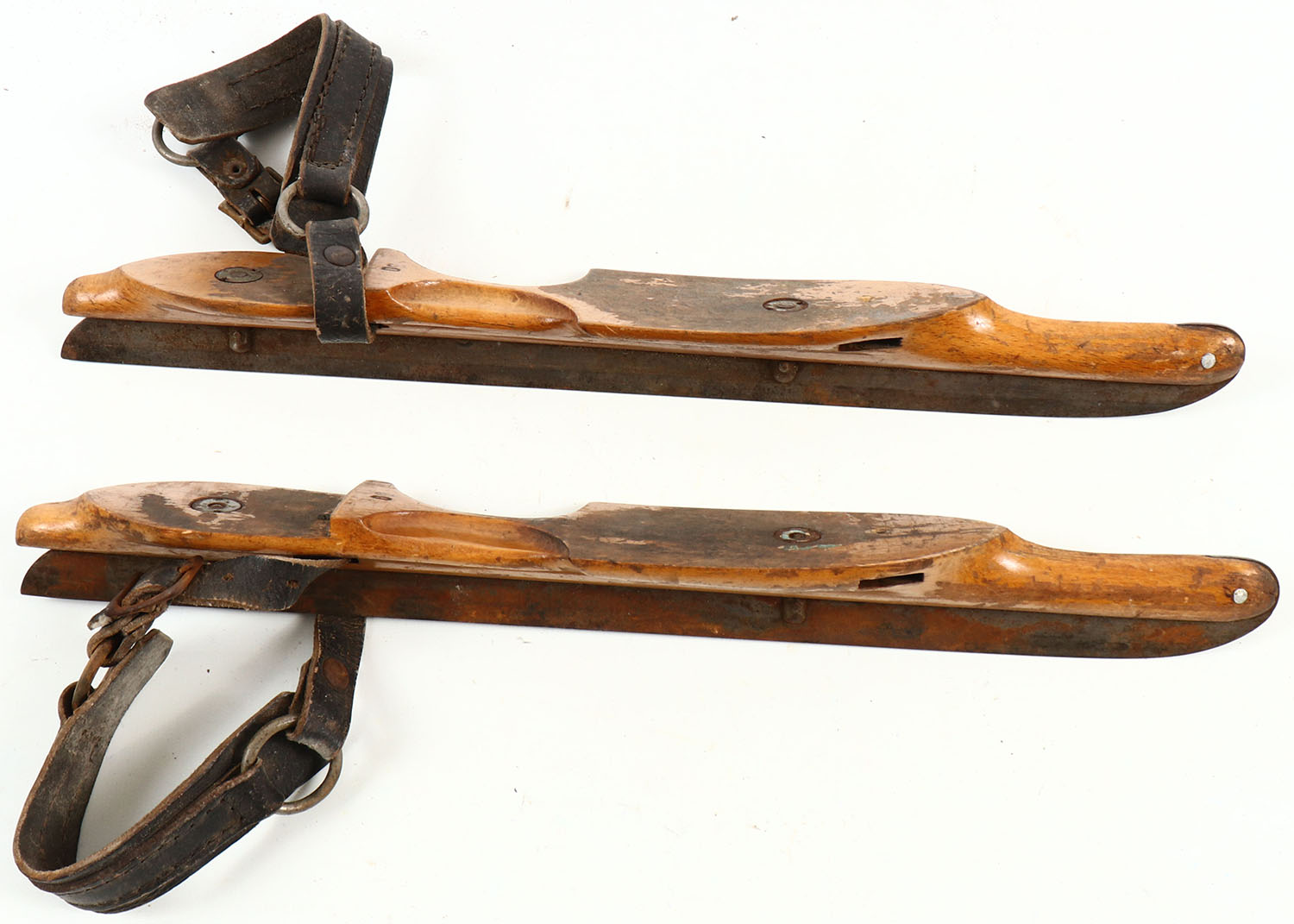 Antique wood ice skates, have age soiling. Grade: Very Good - Value: 4 to 40