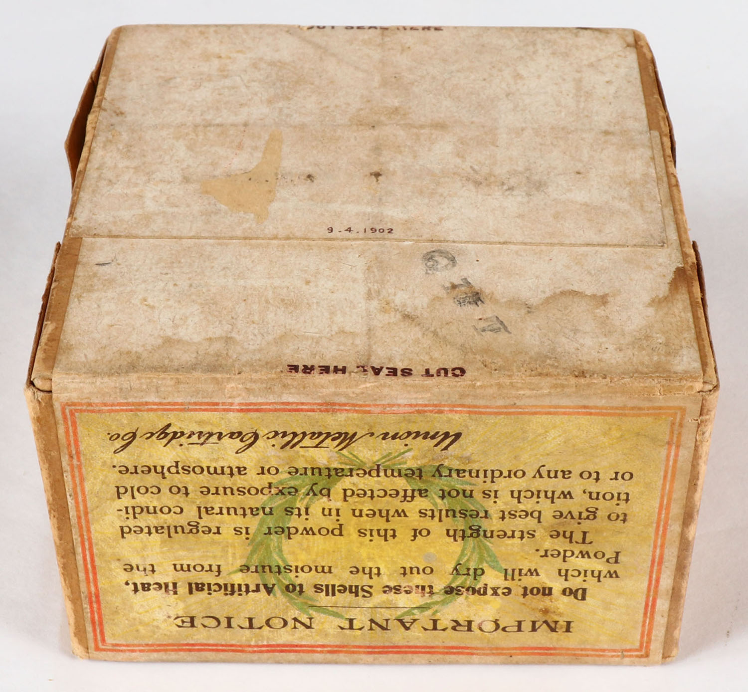 UMC, ARROW, WALKING MAN SERIES, 12ga., 2pc., FULL & SEALED, shot size 7 1/2, buff box with multi colored label pictures hunter shooting from boat in center, Canvasback in bottom left hand corner & a Mallard in the bottom right, box is all original and solid, box has age soiling with minor edge wear with wonderful colors, Hard To Find Box. Grade: Excellent - Value: 1000 to 4000