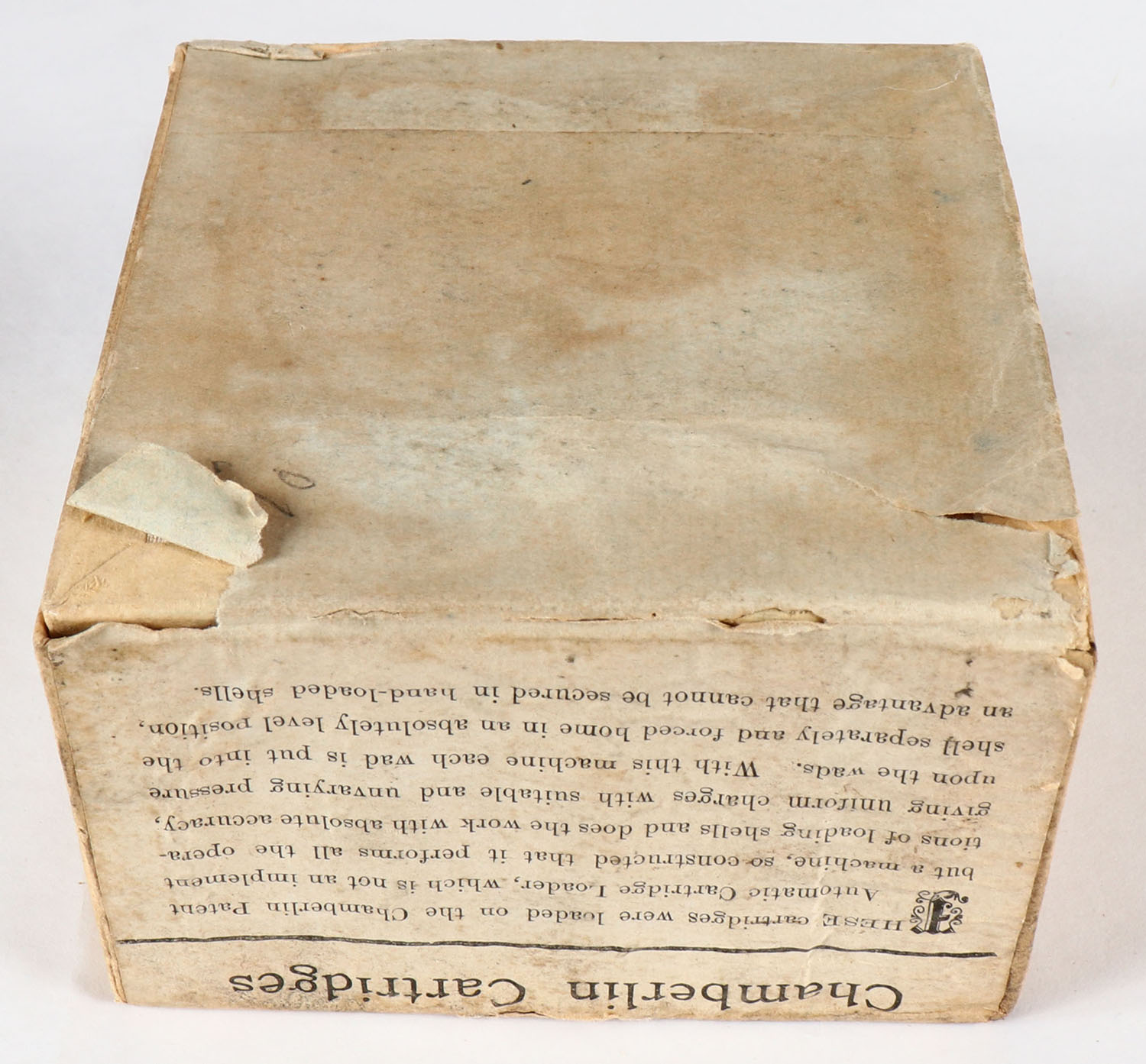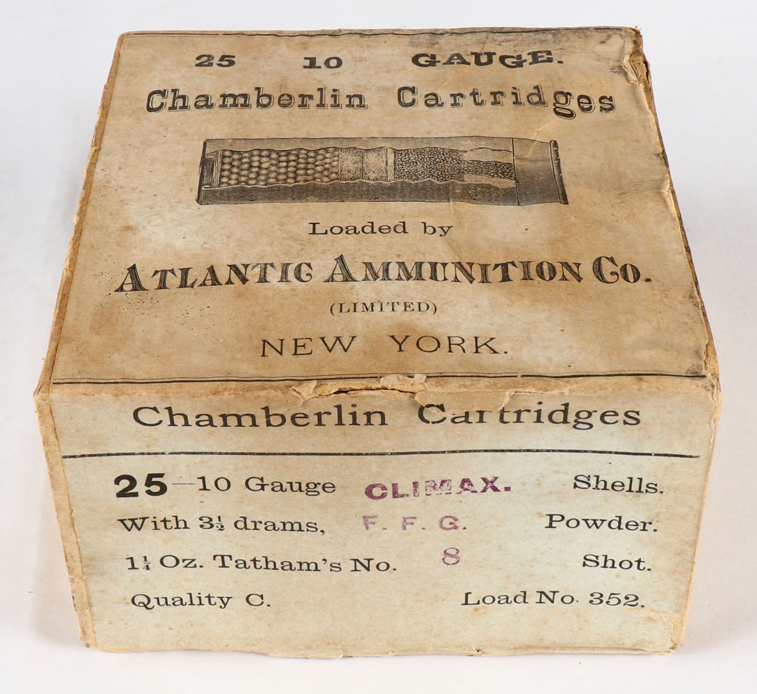 Chamberlin Cartridges, 10ga., 2pc., FULL & SEALED, shot size 8, buff box with buff & black label, box has age soiling & scuffing, box has a seam split with edge wear. Grade: Very Good + - Value: 500 to 1000