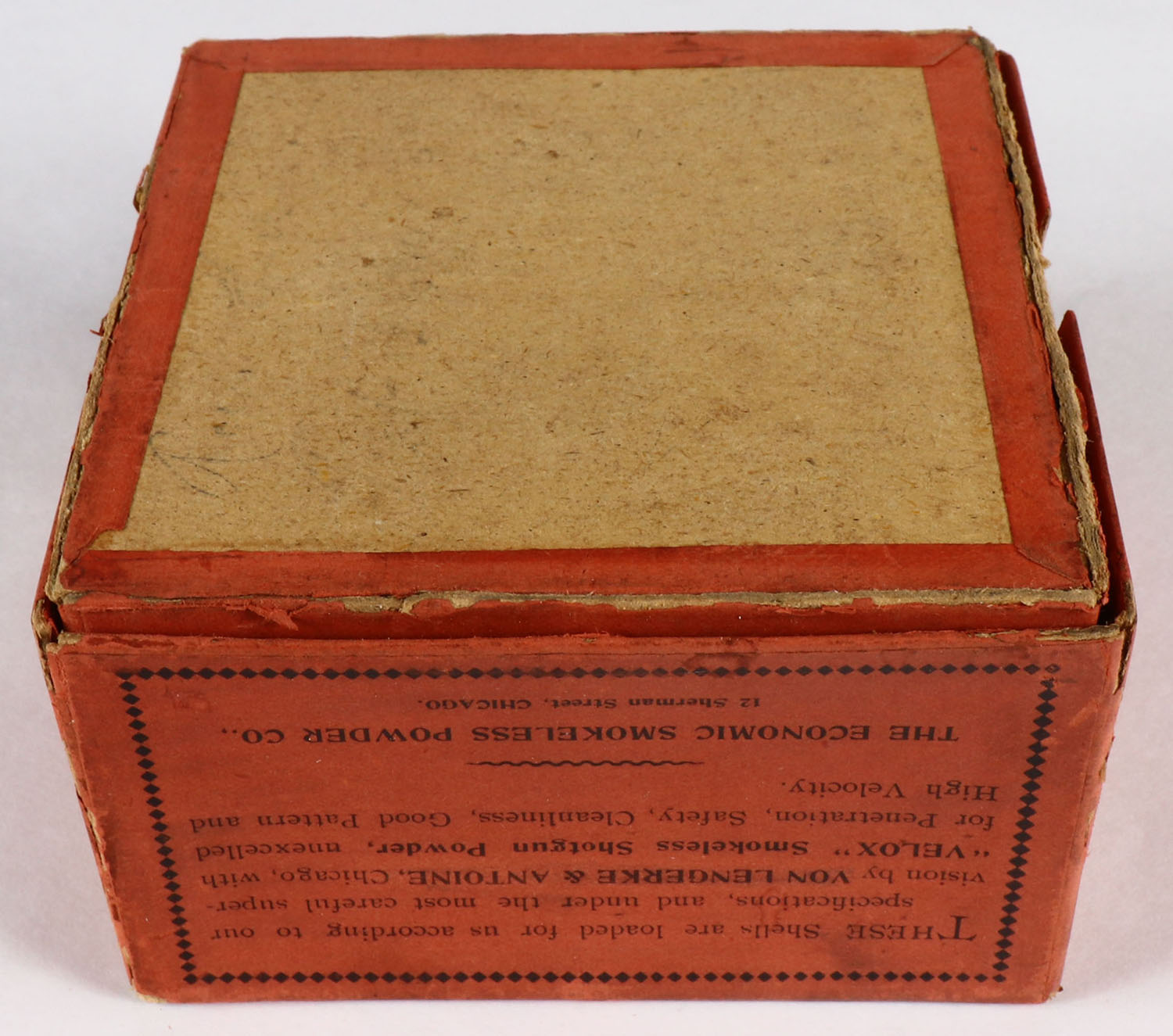 Von Lengerke & Antoine Hand Loaded Cartridges, 12ga., 2pc., Empty, shot size 7, Buff box with black & orange label, box is solid with a seam split, has excellent colors with minor edge wear. Grade: Excellent - Value: 200 to 1000