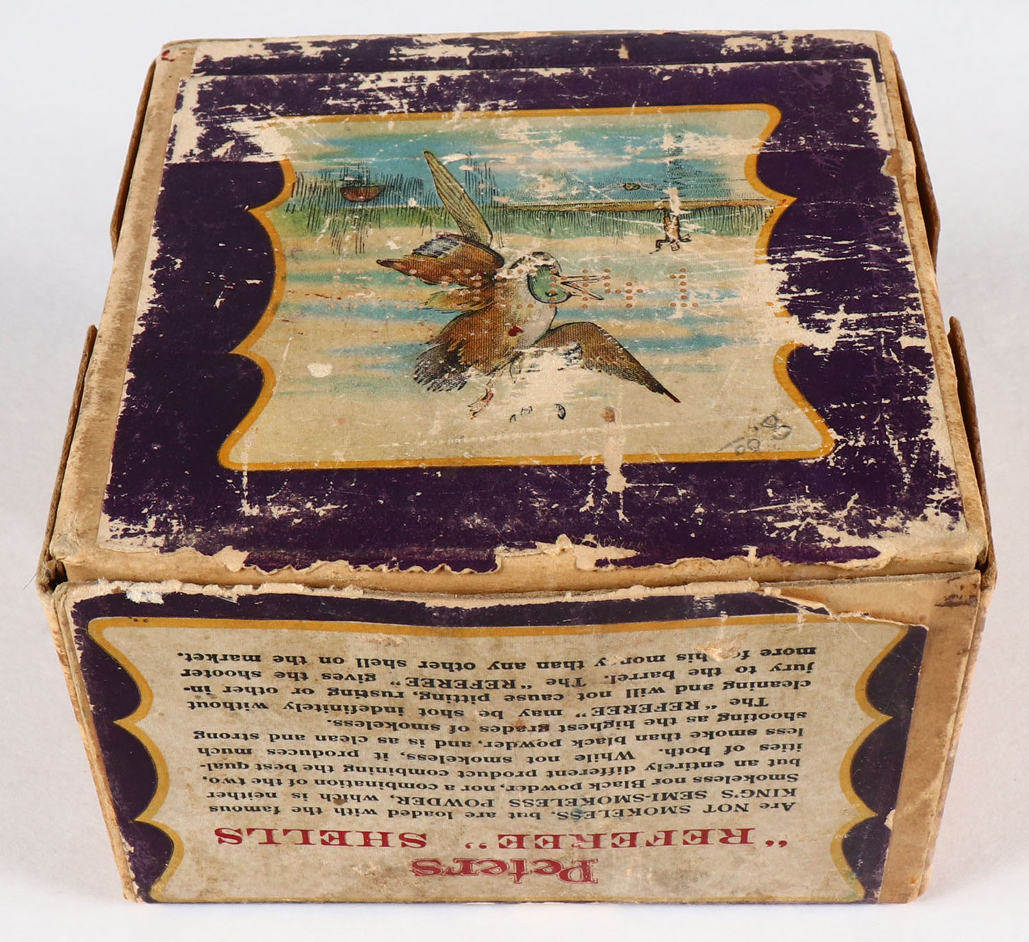 Peters Cart. Co., Referee, 10ga., 2pc., Empty, Shot size 6, Loading: No. B 76, 2 7/8'', 4 Drs., 1 1/8 Oz., No. 6 Shot, buff box with multi-colored label with flying ducks, box is solid with color to label, box has scuffing & age soiling. Grade: Very Good ++ - Value: 100 to 400