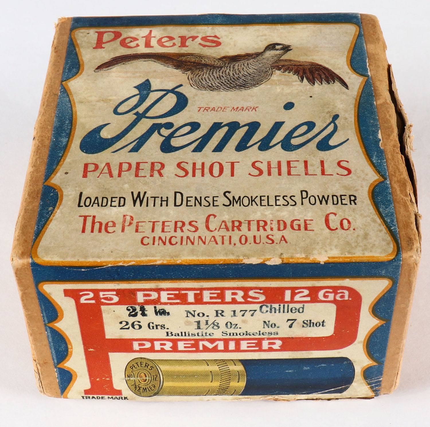 Peters Cart. Co. PREMIER, 12ga., 2pc., FULL, shot size 7 CH., buff box with multi colored label that pictures a flying Prairie Chicken, box has a seam split to top, has light age soiling & edge wear, paper shells are excellent. Grade: Very Good ++ - Value: 200 to 1000