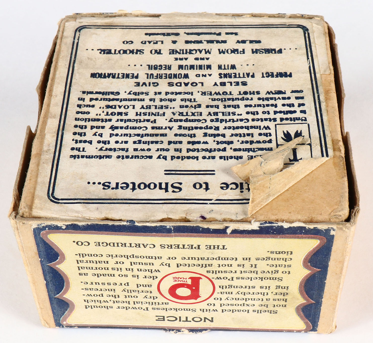 Peters Cart. Co., HIGH GUN, 12ga, 2pc., Empty, shot size 6 CH, buff box with multi colored picture of Snipe, Ballisite Smokeless, box is solid with light fading to top with edge wear, has incorrect bottom, picture of the correct bottom is one that has been printed off the computer and placed over the bottom of the box. Grade: Good ++ - Value: 100 to 500