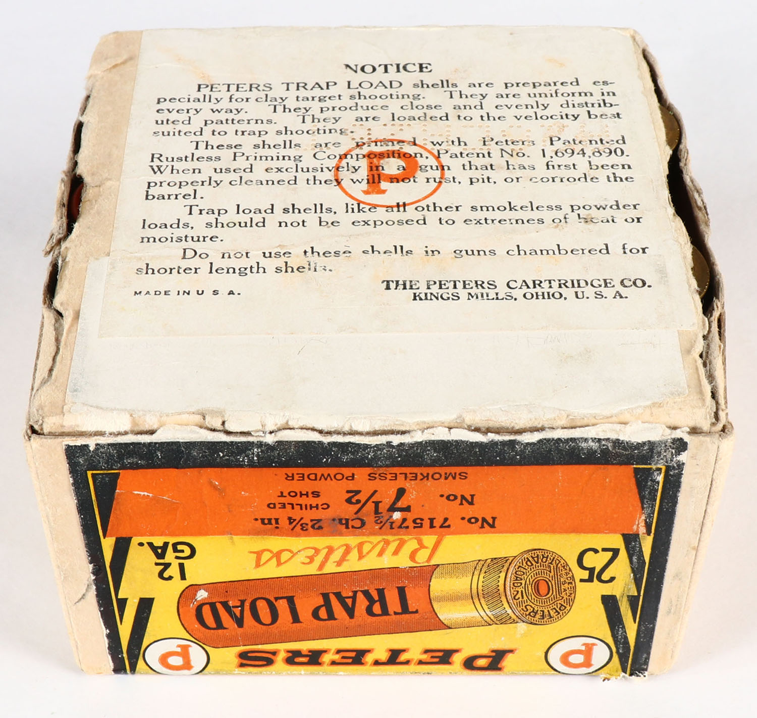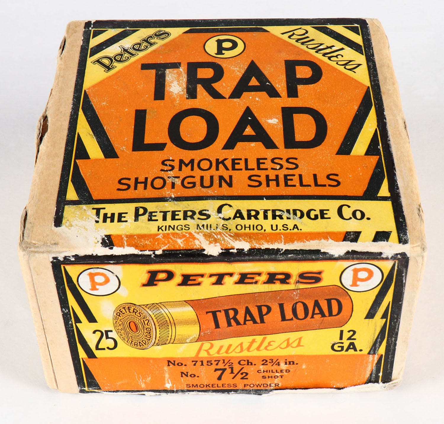 Peters Cart. Co., TRAP LOAD, 12ga., 2 3/4'', 2pc., FULL, ''HALLOWEEN BOX'' buff box with orange, yellow, white & black paper label, shot size 7 1/2 Ch., box has shell protrusions, scuffing & edge wear, paper shells are excellent. Grade: Very Good ++ - Value: 400 to 1000