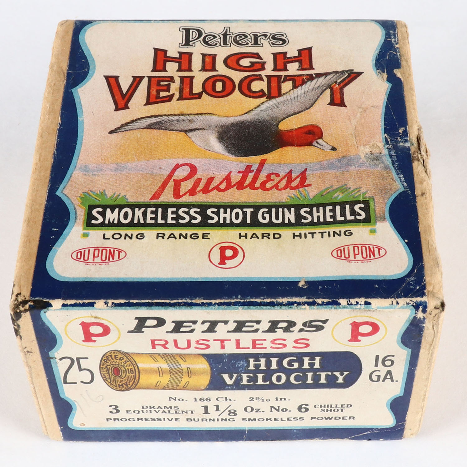 Peters Cart. Co., RED HEAD BOX, 16ga., 2pc., Empty, shot size 6 Chilled Shot, buff box with multi colored label that pictures RED HEAD in flight, 2 9/16'', Loading: No. 166 Ch, 3 Drams, 1 1/8 Oz., No. 6 Chilled Shot, box has very light scuffing with edge wear. Grade: Very Good ++ - Value: 100 to 500