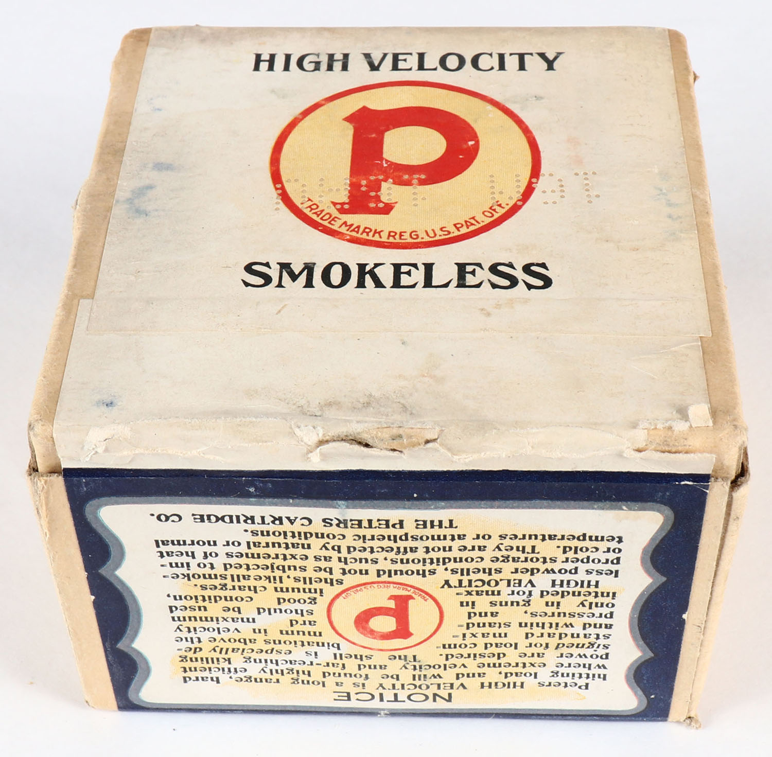 Peters Cart. Co., Blue Wing Teal, 12ga., 3'', 2pc., FULL & HALF SEALED, shot size 7 CH, buff box with multi colored label that pictures Blue Wing Teal in flight, box has very minor edge wear, box is very solid has great label with great color. Grade: Excellent - Value: 400 to 800