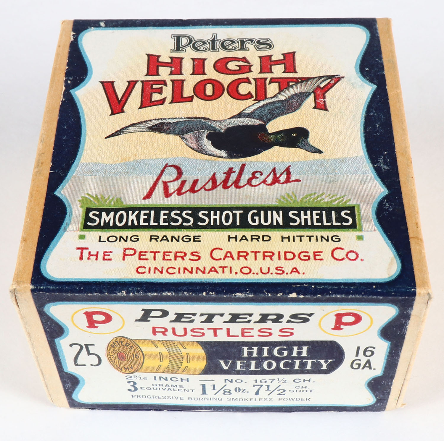 Peters Cart. Co., Blue Bill, 12ga., 2pc., FULL & SEALED, shot size 7 1/2 CH., buff box with multi colored label that pictures Blue Bill in flight, box is very solid with excellent colors. Grade: Excellent + - Value: 200 to 800