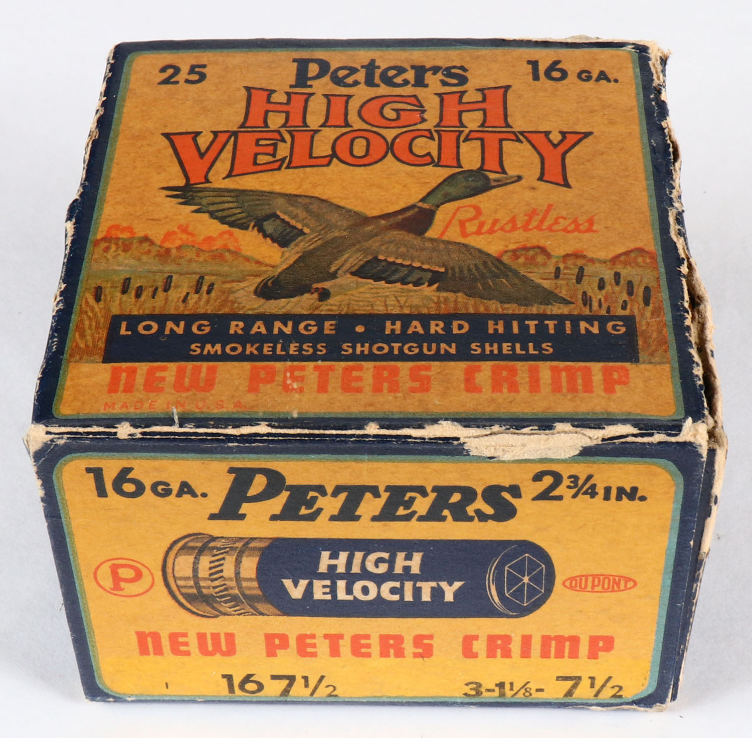 Peters Cart. Co., High Velocity, New Peters Crimp, 16ga., 1pc., Full, shot size 7 1/2, multi colored box that pictures mallard flying out of the marsh grass, box has age soiling with edge wear, paper shells are excellent. Grade: Very Good - Value: 20 to 100