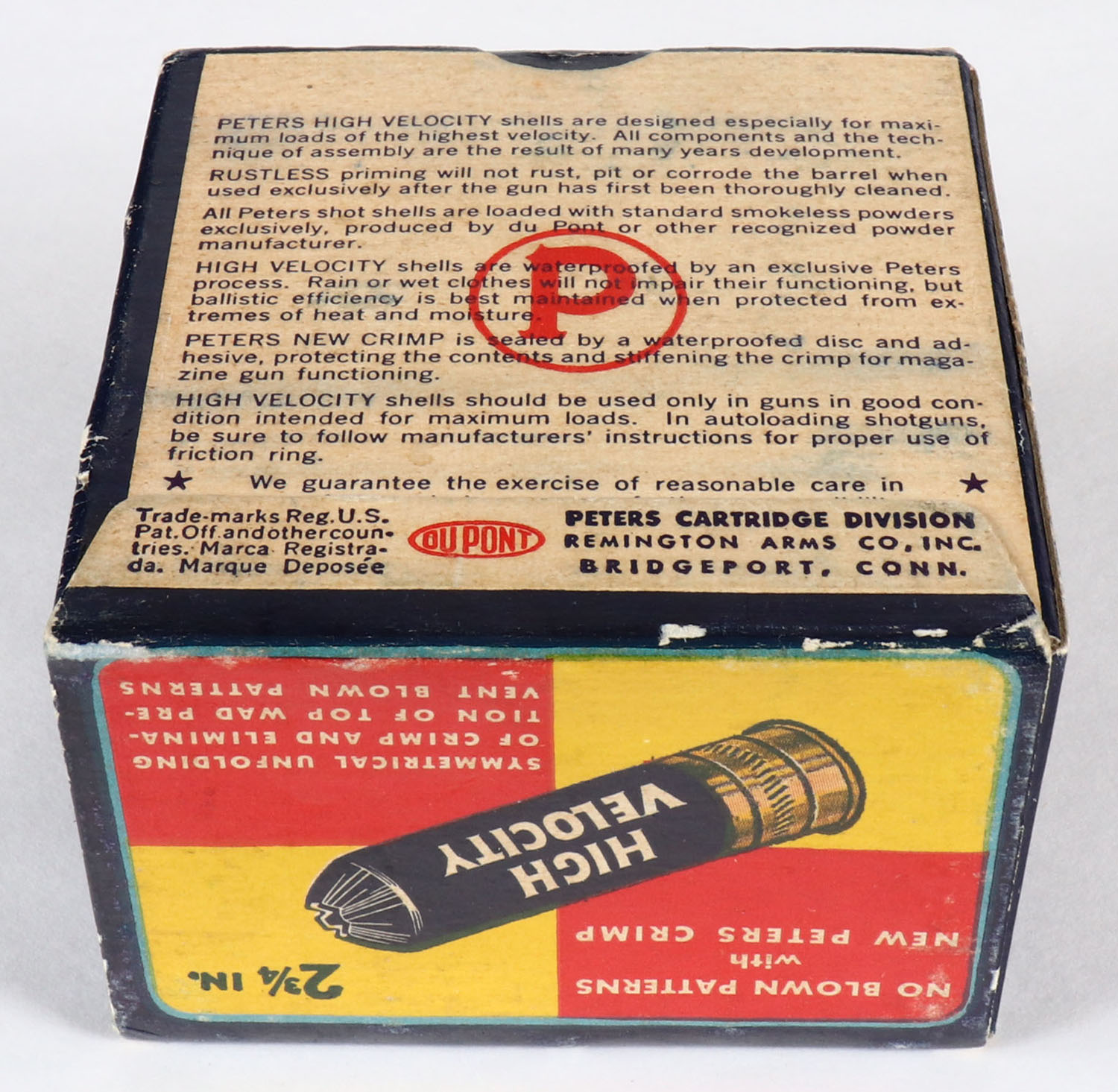 Peters Cart. Co., High Velocity, New Peters Crimp, 20ga., 1pc., Full, shot size 6, multi colored box that pictures mallard flying out of the marsh grass, box is solid with edge wear, paper shells are excellent. Grade: Excellent - Value: 20 to 100