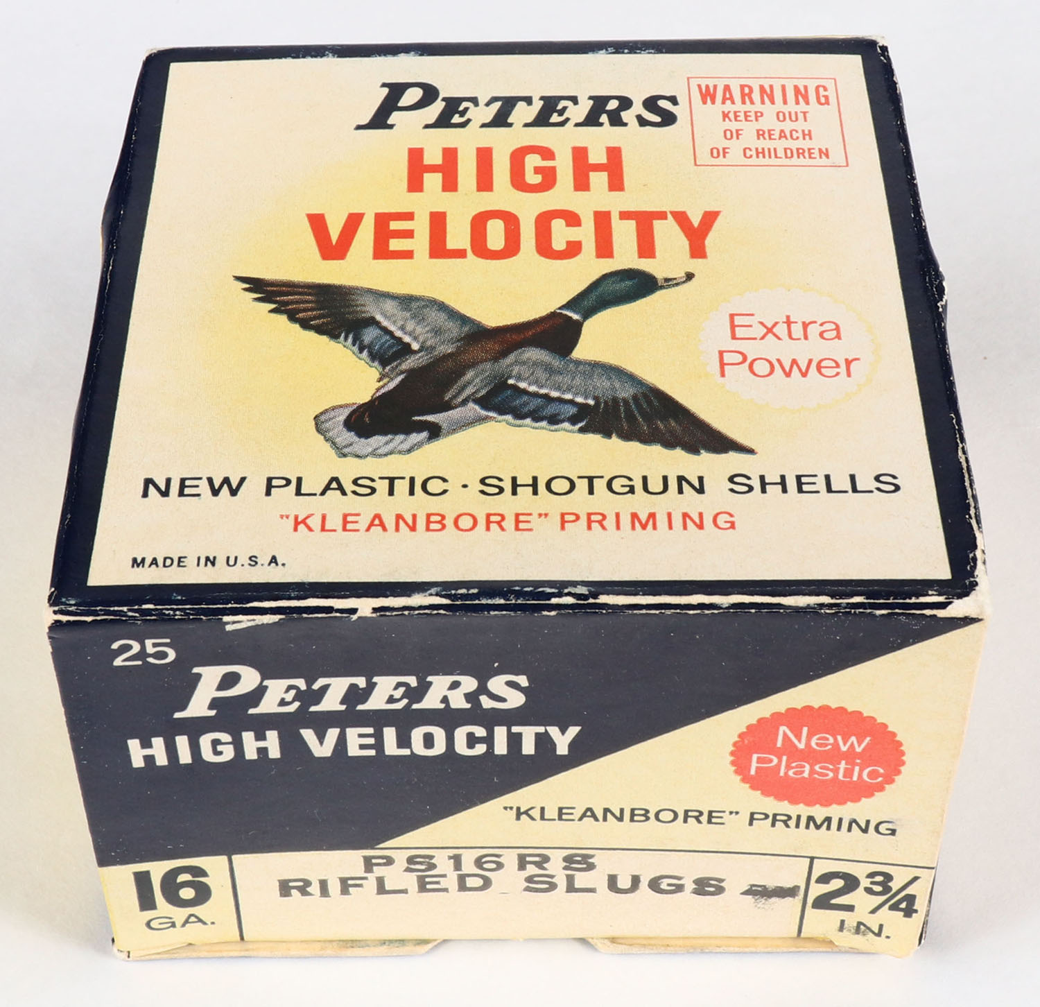 Peters, High Velocity, 16ga, 2 3/4'', 1pc., Full, shot size Riffled Slugs, multi colored box that pictures mallard flying, box is solid with great color, plastic shells are excellent. Grade: Excellent - Value: 10 to 40