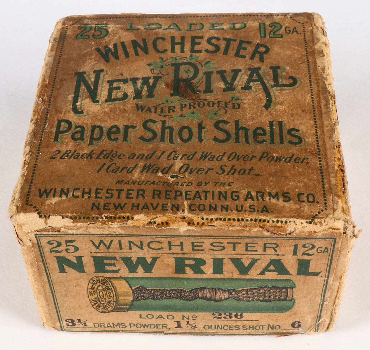 RARE!! Winchester, New Rival, 12ga., 2pc., has Insert, Partial 24rds, Shot Size 6, Buff box with buff & green label, box has tape & glue repairs, edge wear & age soiling, paper shells are very good. Grade: Very Good ++ - Value: 400 to 1500