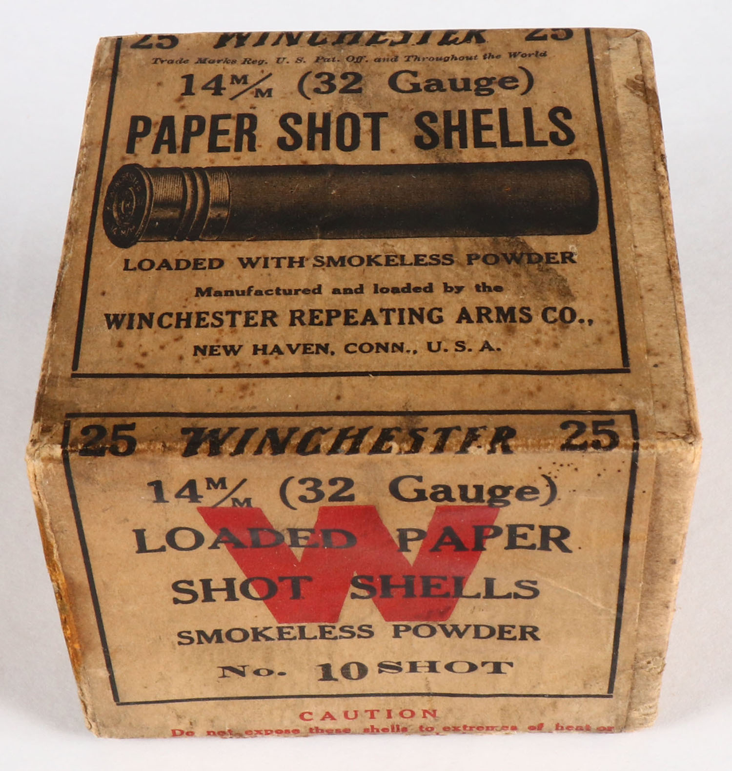 RARE Winchester, 32 GAUGE! 14m/m (32 Gauge), 2pc., FULL, PAPER SHOT SHELLS, shot size 10, buff box with buff, red & black label, box is solid with nice colors, box has scuffing & light soiling, VERY RARE & HARD TO FIND IN 32 GAUGE. Grade: Very Good ++ - Value: 150 to 800