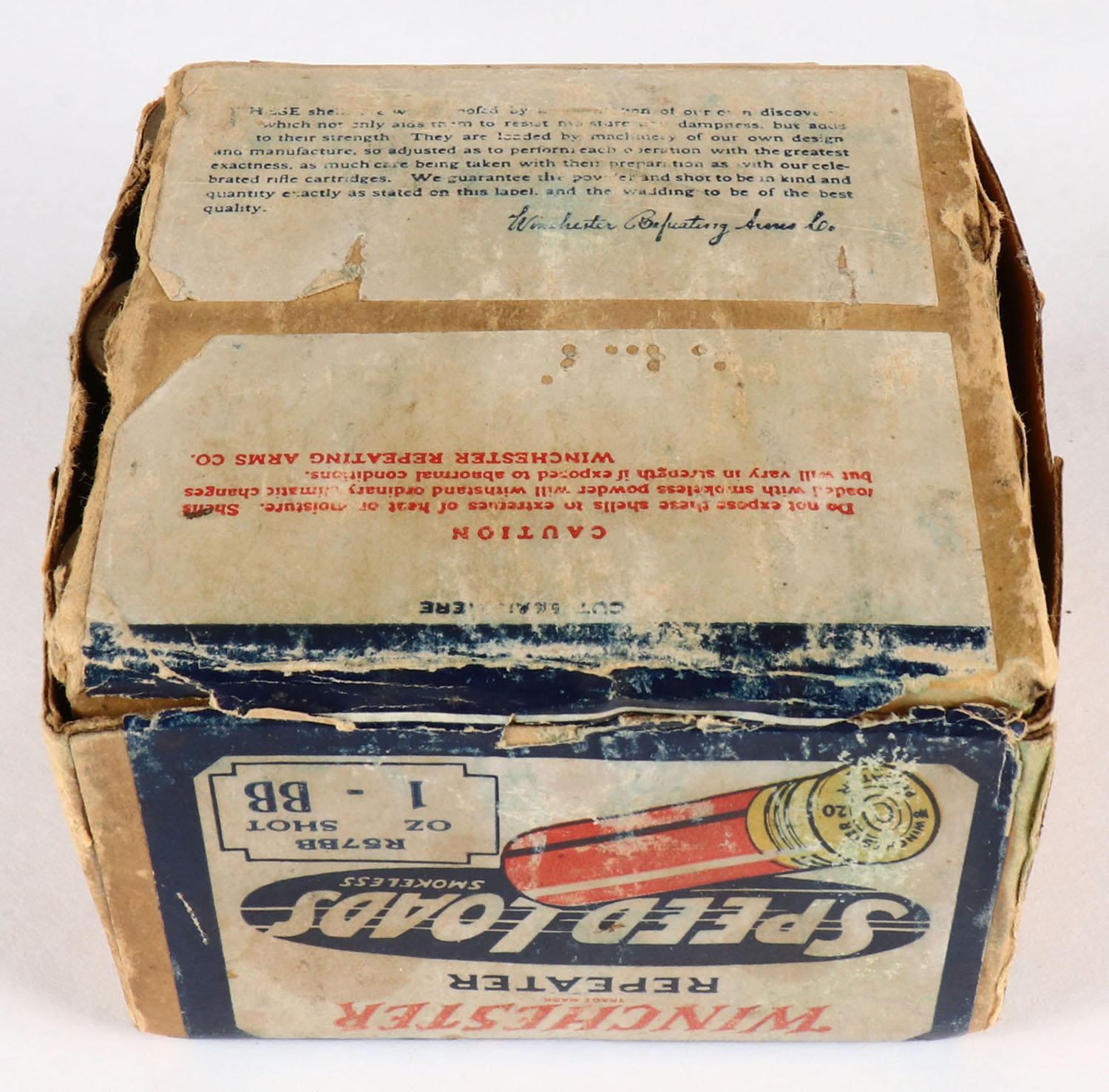 Winchester REPEATER Speed Loads, 20ga., 2pc., FULL, shot size BB, buff box with dark blue red & white paper label, box has soiling & scuffing with seam splits, RARE with the REPEATER markings, paper shells are excellent. Grade: Very Good - Value: 100 to 400