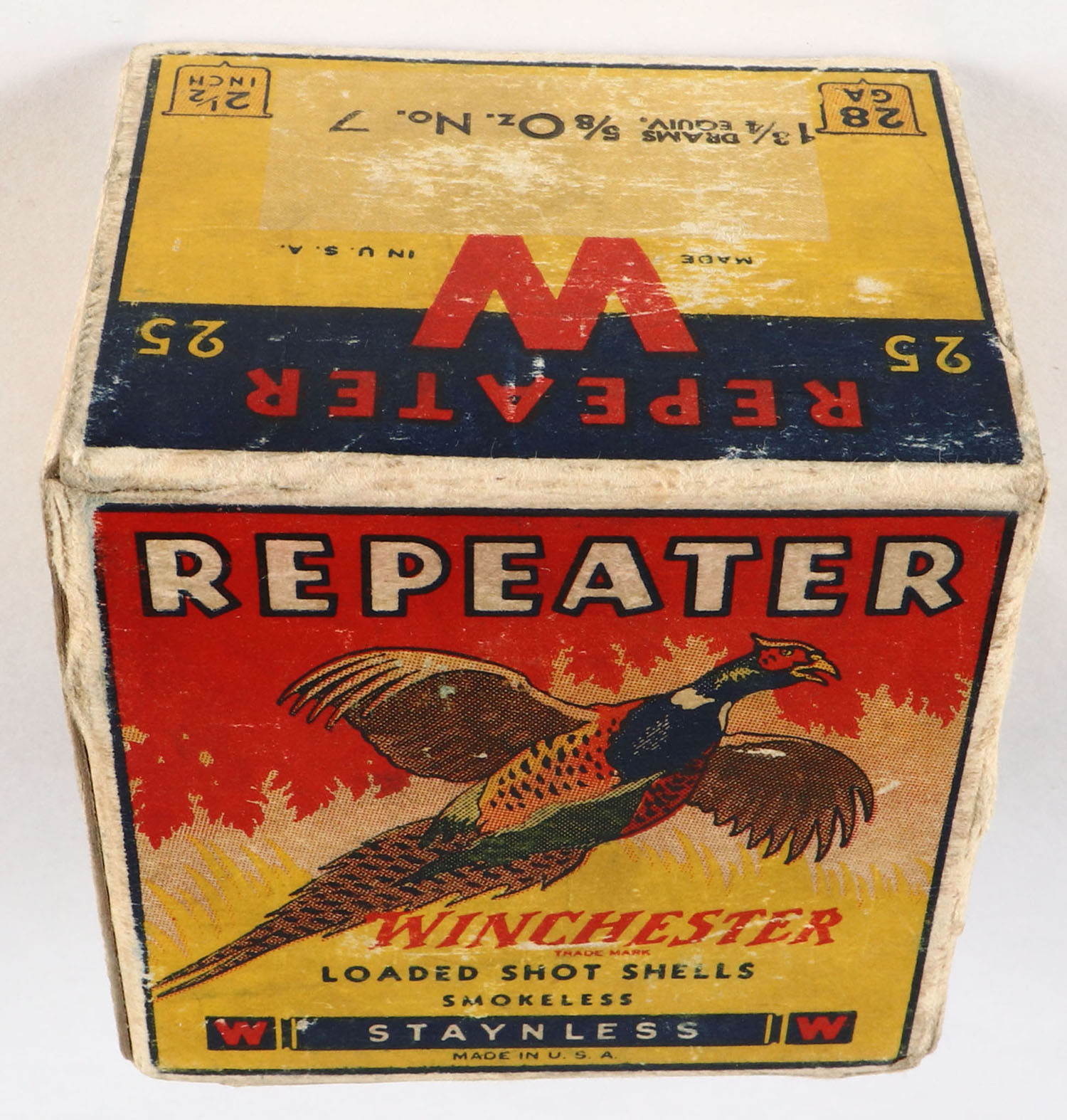 VERY RARE Winchester, PHEASANT BOX, REPEATER, 28ga., 1pc., FULL, Multi-colored PHEASANT BOX!!! Loading: 1 3/4 Drams, 5/8 Oz., 7 Shot, 2 1/2'', box is very solid with light scuffing & light edge wear, box has very nice colors, shells are excellent, HARD TO FIND BOX! Grade: Very Good ++ - Value: 2000 to 6000