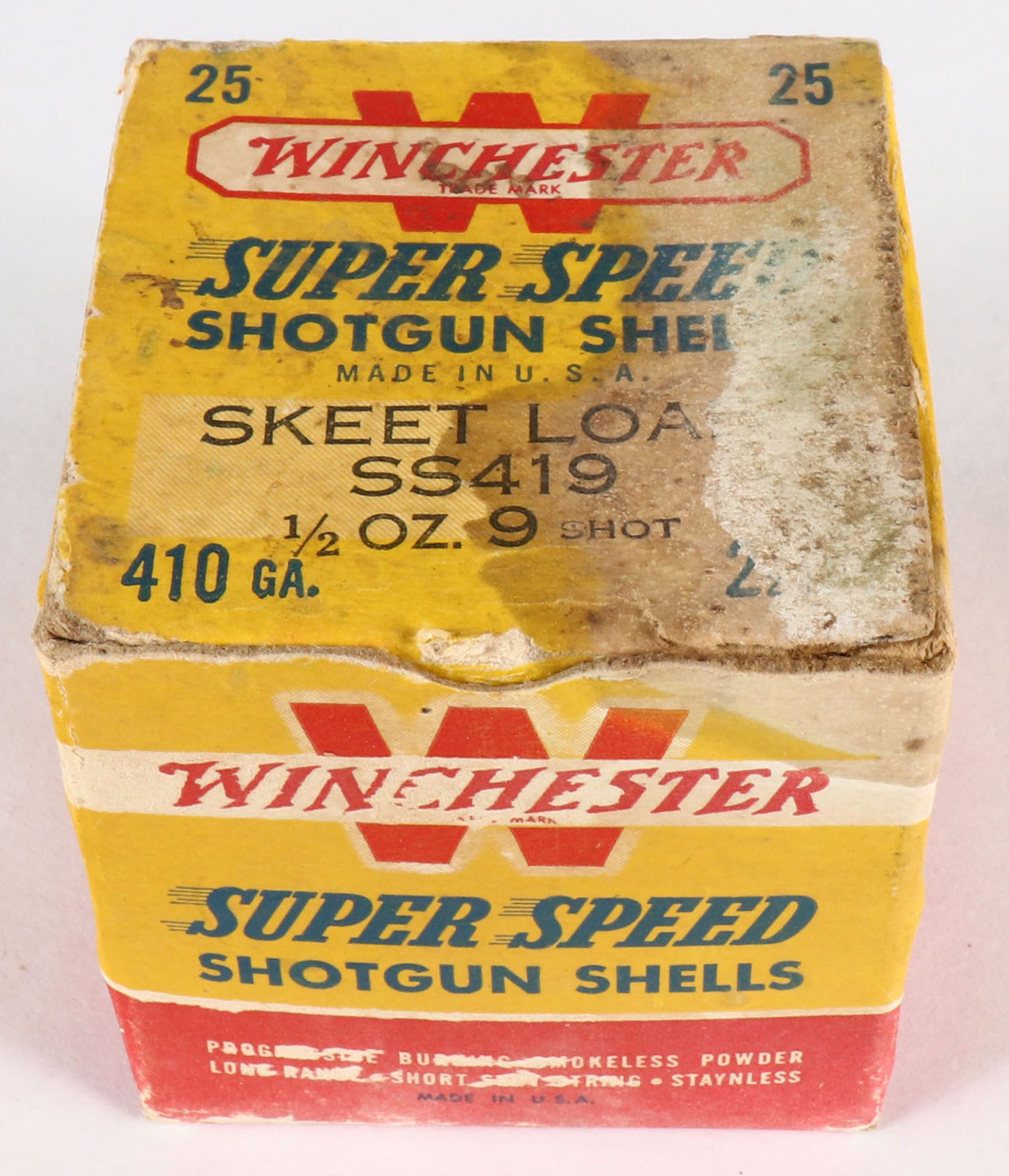 Winchester, Super Speed, 410ga., 2 1/2'', 1pc., Full, shot size 9, Skeet Load, red, black and yellow box, box has soiling with scuffing, paper shells are very good. Grade: Very Good - Value: 10 to 30