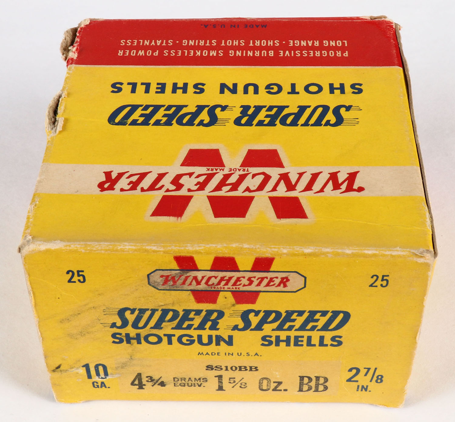 Winchester, Super Speed, 10ga., 1pc., Full, 2 7/8'', shot size BB, red, yellow & blue box, box has shell protrusions, paper shells are excellent. Grade: Very Good ++ - Value: 20 to 100