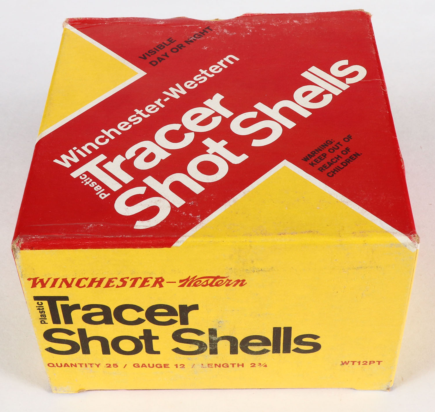 Winchester-Western, Tracer Shot Shells, Visible Day or Night, 12ga., 2 3/4'', 1pc., Full, shot size 8, multi-colored box, box is very solid with minor scuffing, plastic shells are excellent. Grade: Excellent + - Value: 10 to 50