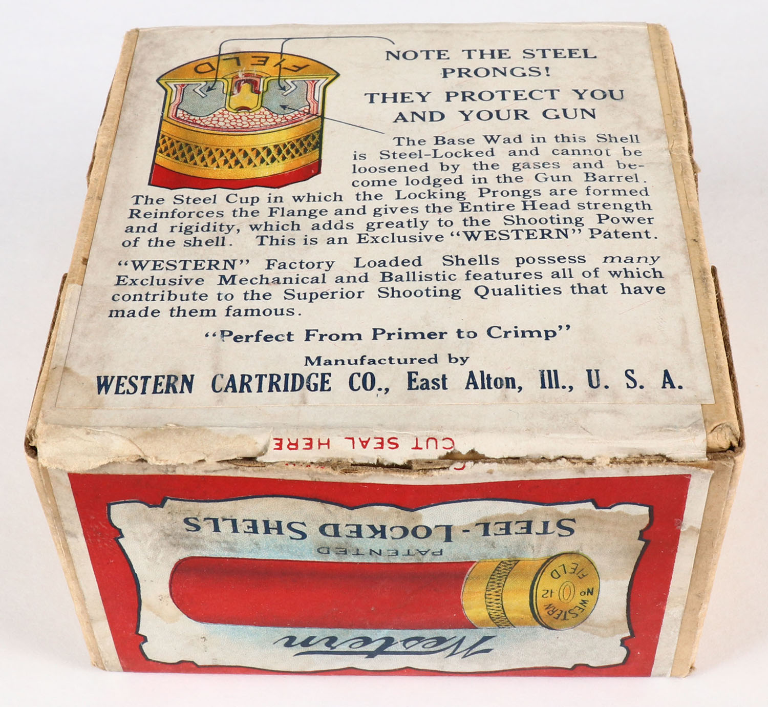 Western, Field/Super X, Label was made during transition from Field boxes to Super X boxes. 12ga., 2pc, Empty, shot size 6 Ch, box is very solid with excellent colors, has scuffing. Grade: Very Good ++ - Value: 20 to 100