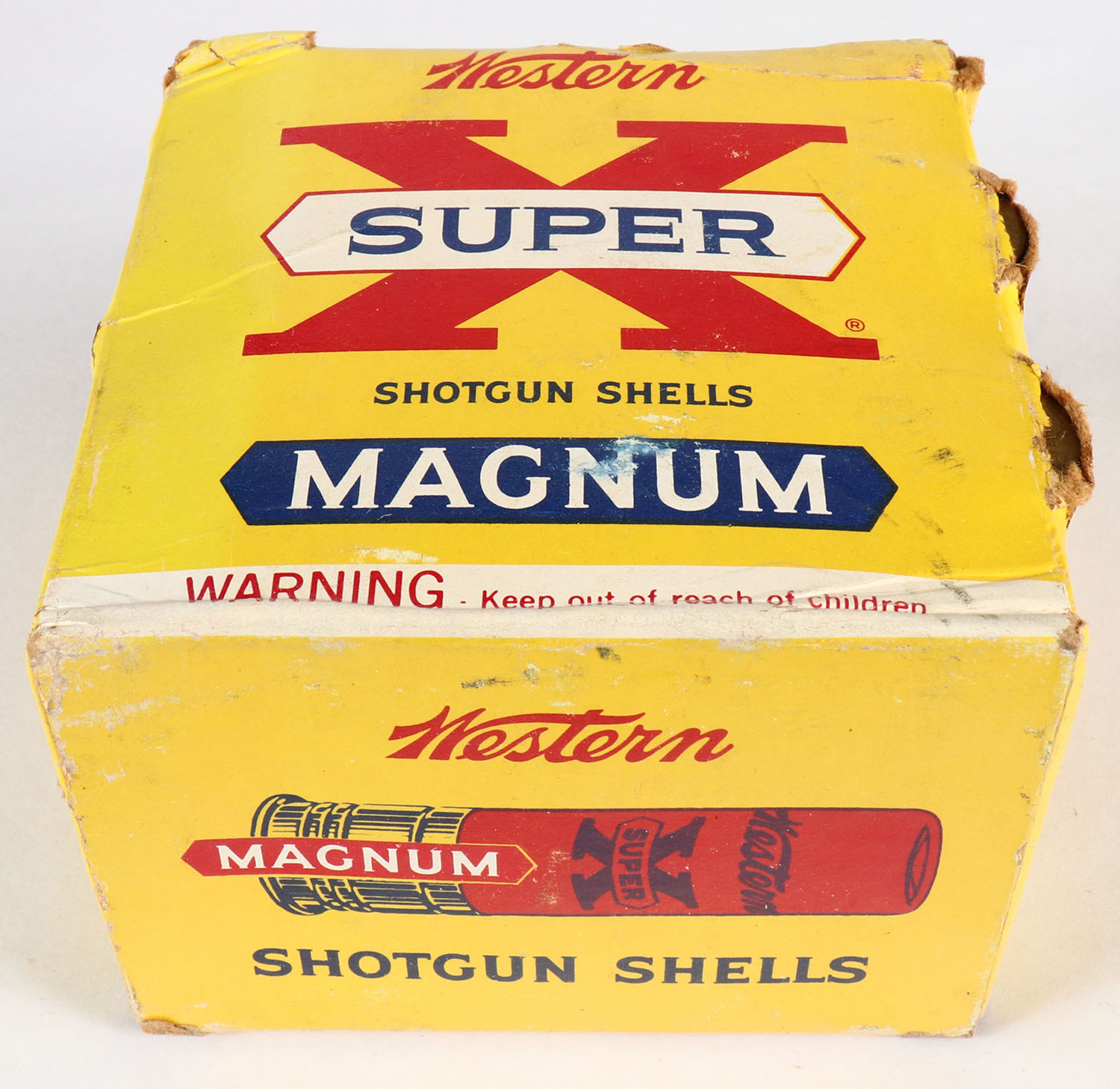 Western, Super X, 10ga., 3 1/2'', 1pc., Full, shot size 2 Magnum, yellow, blue & red box, box has shell protrusions with excellent colors, paper shells are excellent. Grade: Very Good ++ - Value: 20 to 60