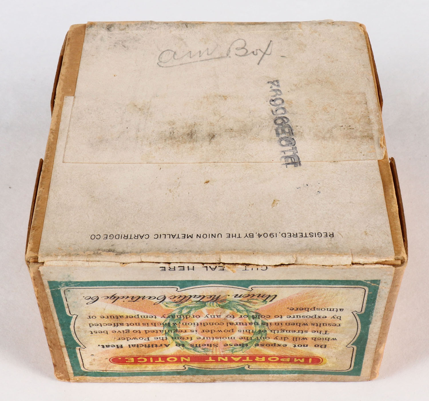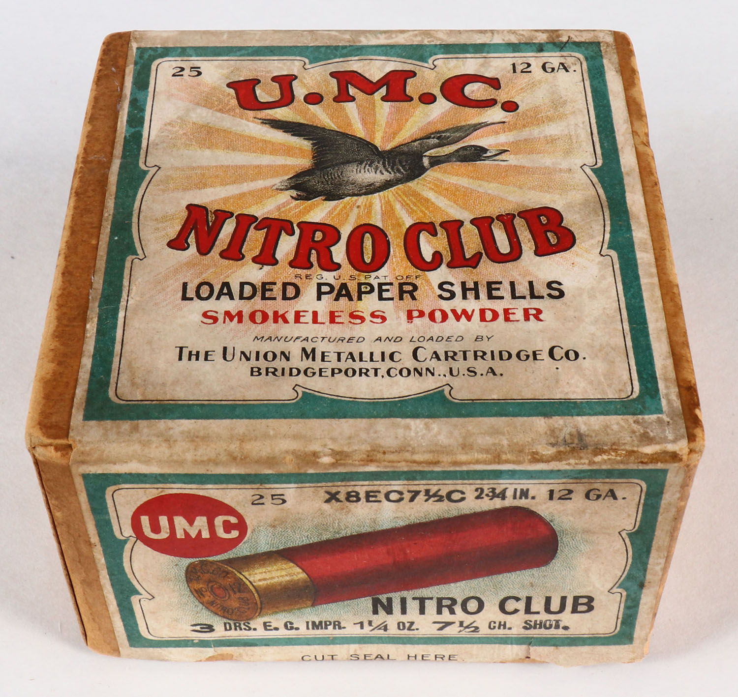 REM UMC, Nitro Club, 12ga., 2pc., Empty, shot size 7 1/2 CH, buff box with sunburst logo & Mallard flying on top, box has nice colors to label with age soiling & minor edge wear. Grade: Very Good ++ - Value: 20 to 80