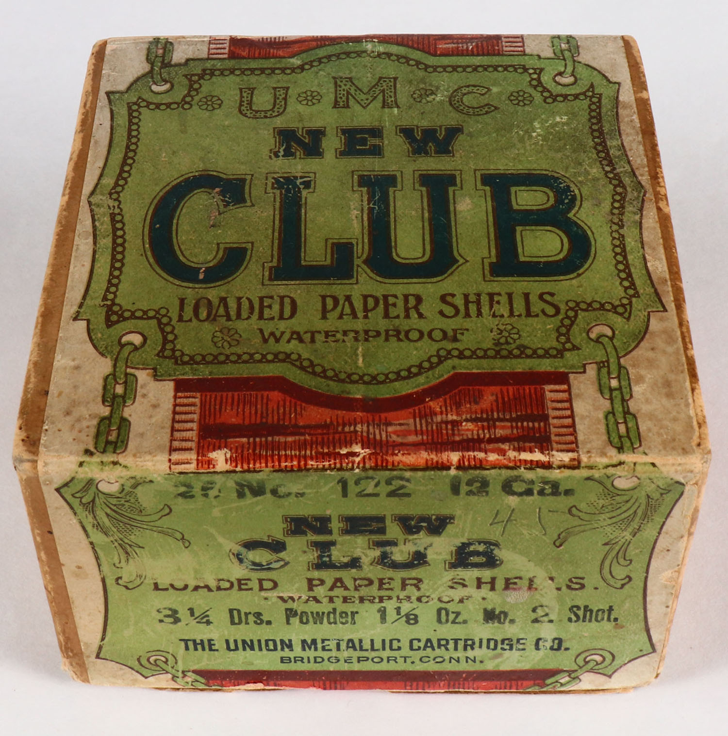 Remington UMC, New Club, 12ga, 2pc., Empty, shot size 2, buff box with multi color label, box has age soiling & scuffing with very nice color to label, box has light edge wear. Grade: Very Good ++ - Value: 20 to 80