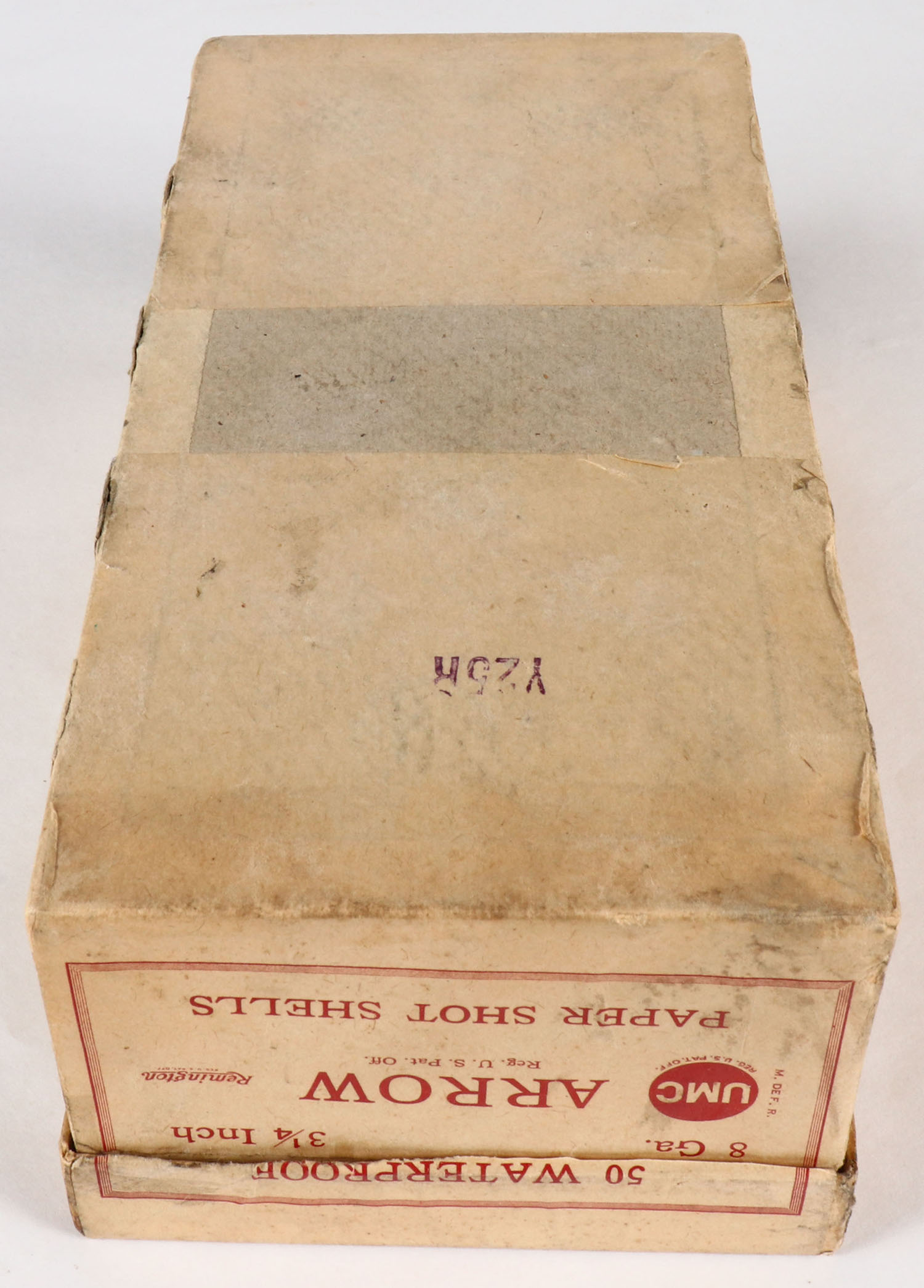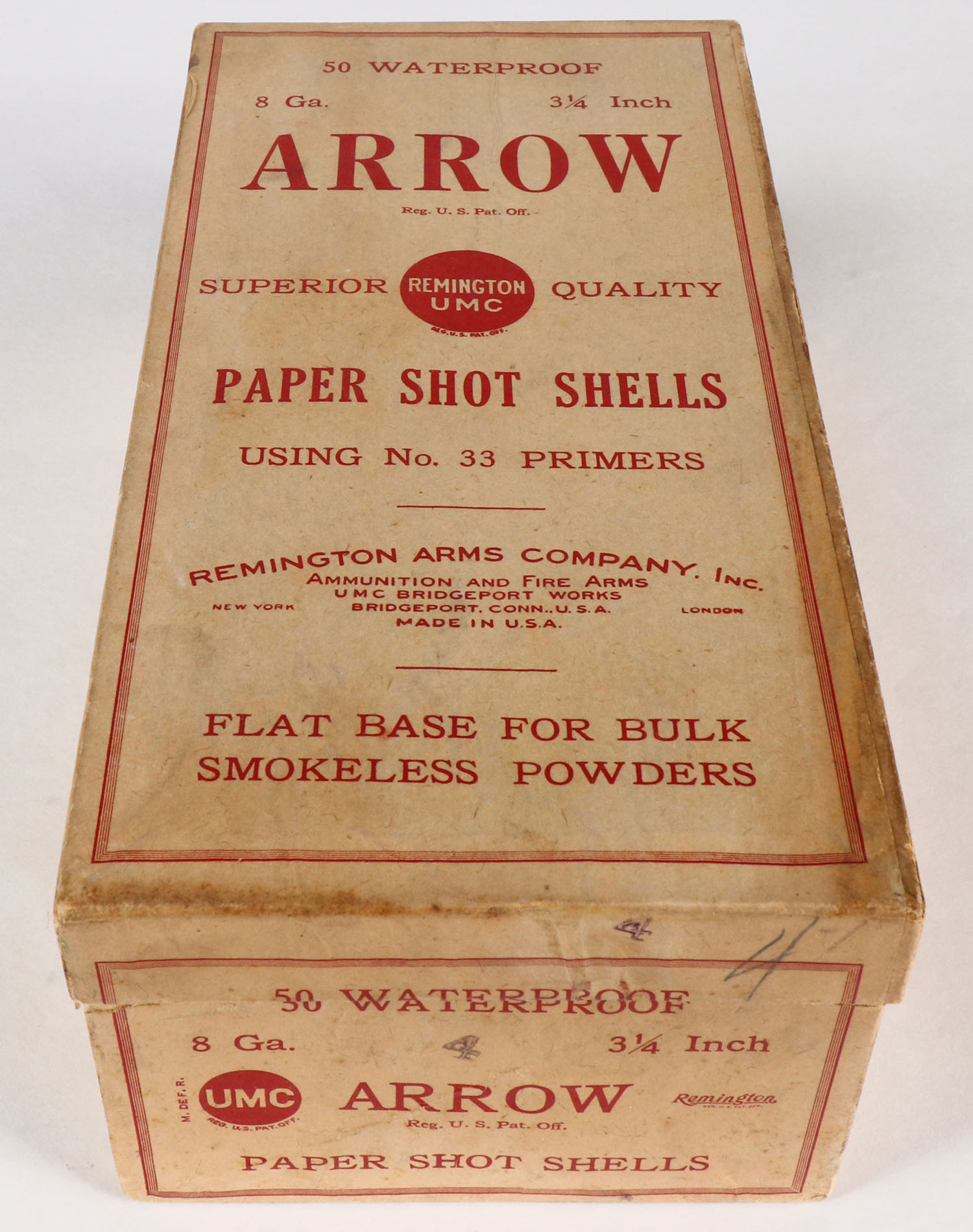RARE SHOE BOX, Remington UMC, ARROW, 8ga., 2pc., Full, 4 Shot (full of NPE), 3 1/4 Inch., buff box with buff & red label, box is very solid with light age soiling & scuffing, shells are excellent. Grade: Very Good ++ - Value: 800 to 3000