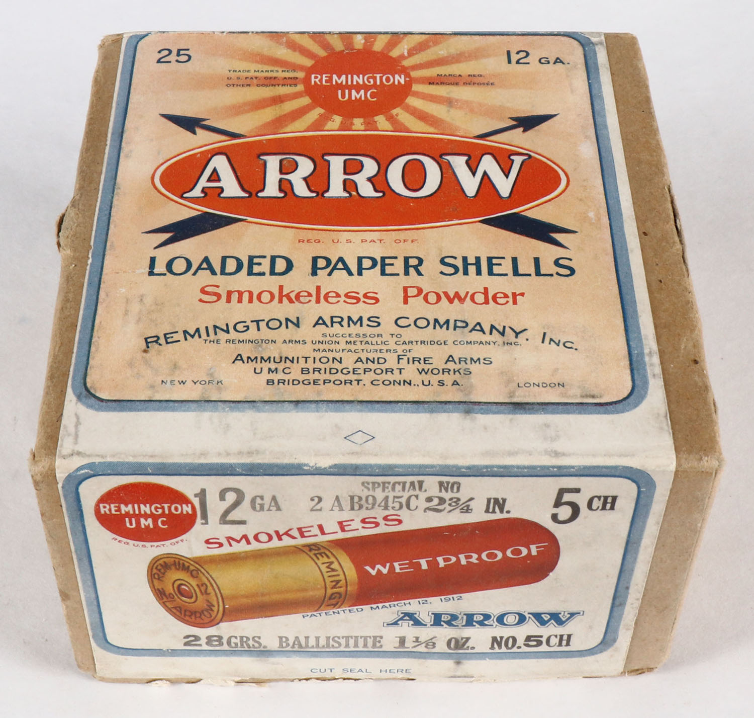 REM-UMC, ARROW, 12ga., 2pc., FULL, shot size 5 CH, buff box with sunburst logo & multi-colored label, box has light soiling with light shell protrusion, paper shells are very good. Grade: Very Good ++ - Value: 60 to 200