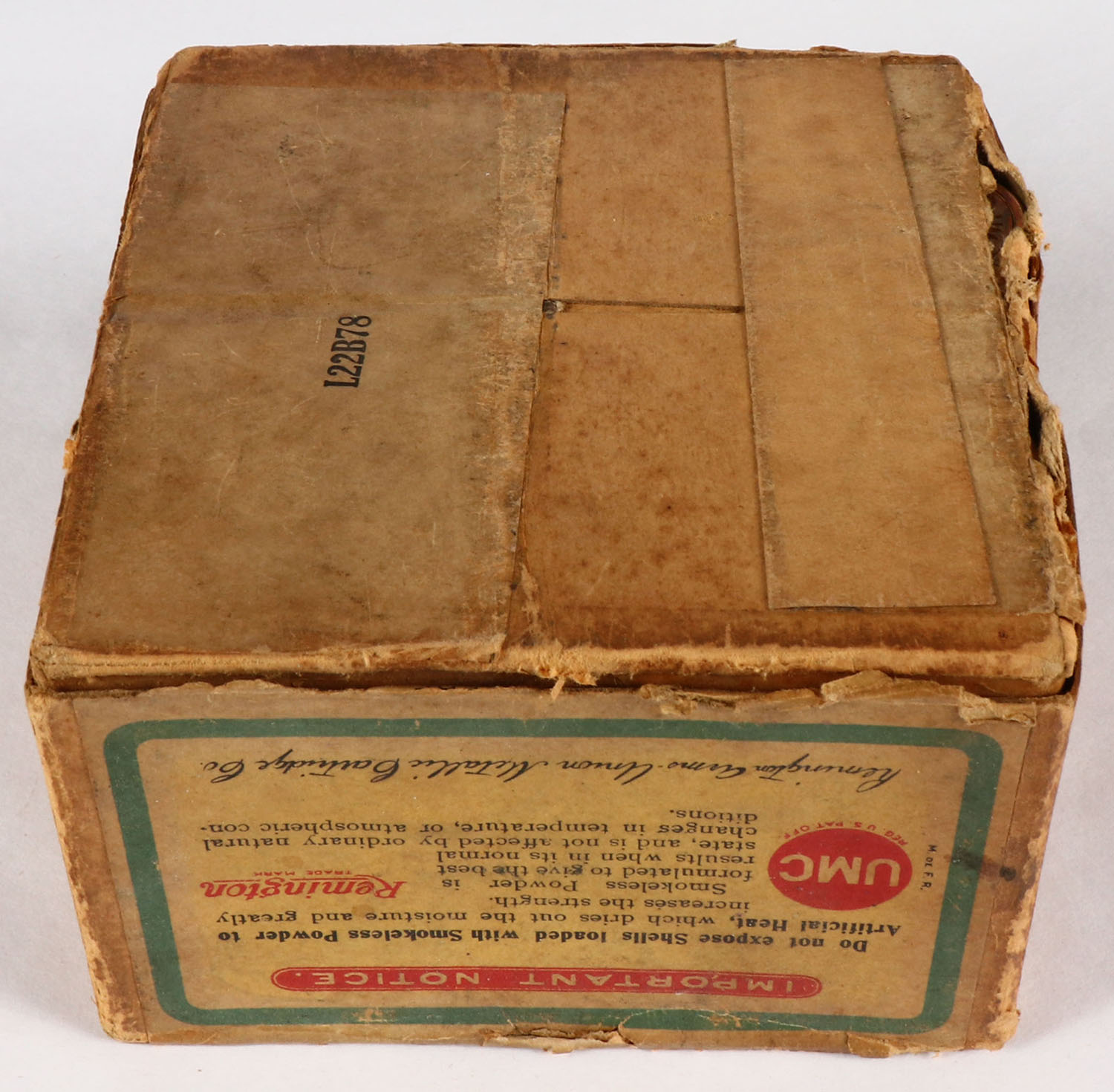 Remington UMC, Nitro Club, 10ga., 2pc., Full, Loading: 3 1/2 Drs. 1 1/4 Oz., shot size 6, buff box with sunburst logo & Mallard flying on top, box has age soiling & scuffing, has edge wear with a seam split, paper shells are excellent. Grade: Very Good - Value: 100 to 400