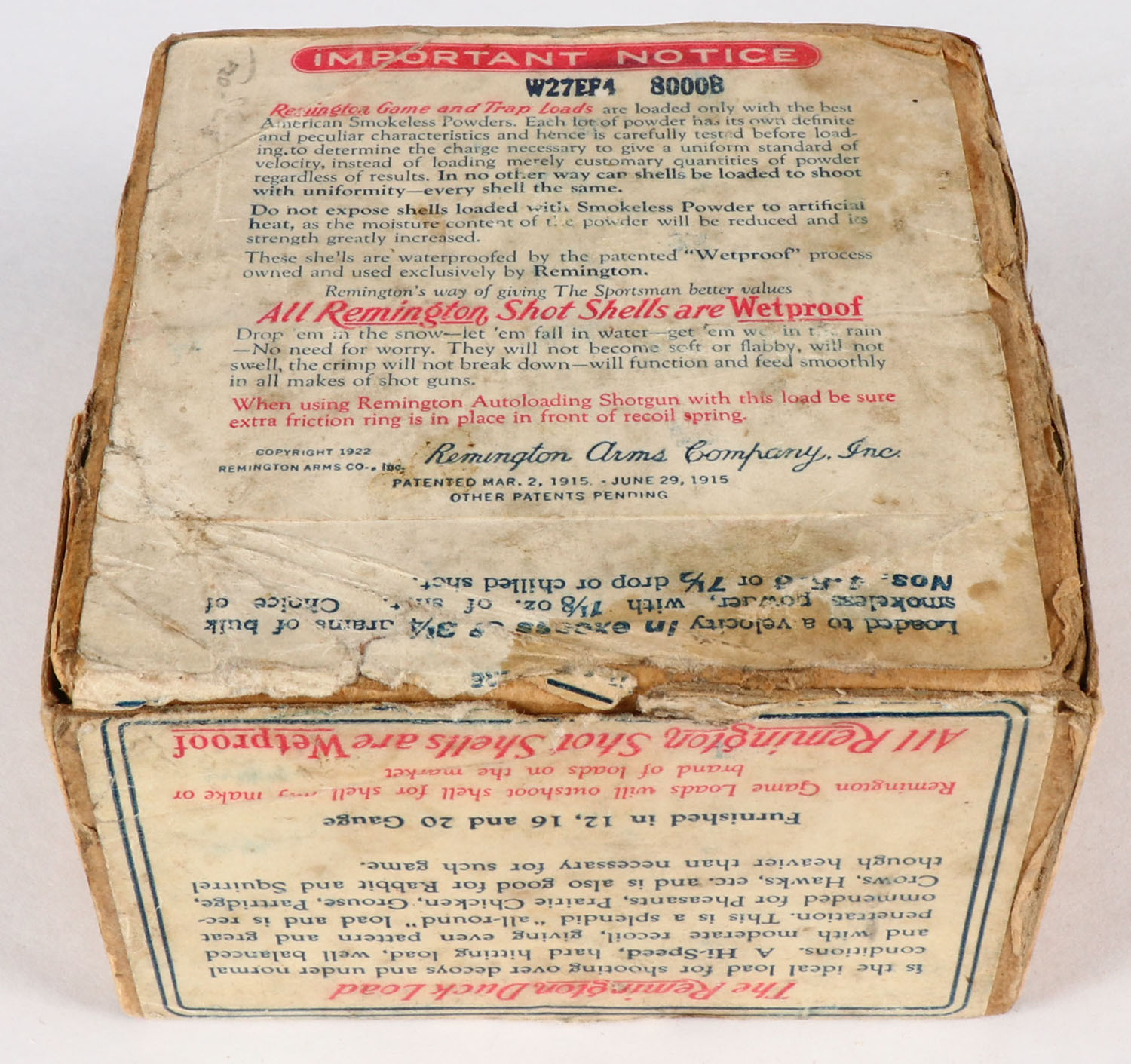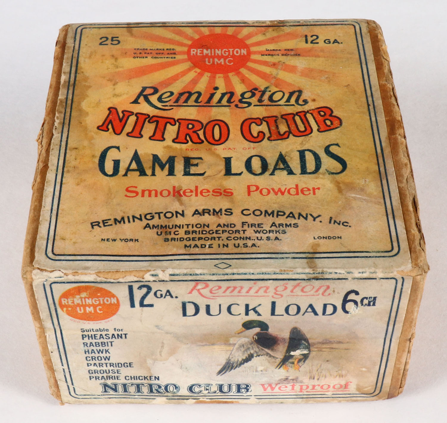 Remington Nitro Clubs, GAME LOADS, DUCK LOAD, 12ga., 2pc., Full, shot size 6CH, buff box with sunburst logo & Mallard Landing on side, labels are original, box has scuffing with age soiling & edge wear, paper shells are excellent. Grade: Very Good - Value: 150 to 300