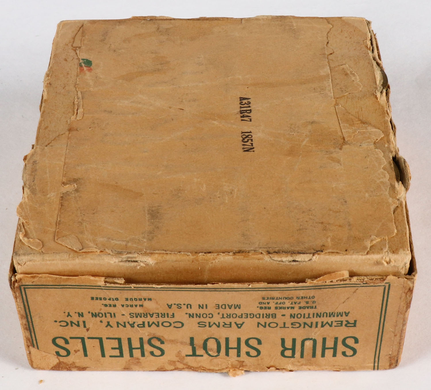 Remington, SHUR SHOT, 12ga., 2'', 2pc., Full, shot size 9 C, Buff box with buff, green & red paper label, box has scuffing & edge wear with shell protrusion, shells are very good. Grade: Very Good - Value: 60 to 200