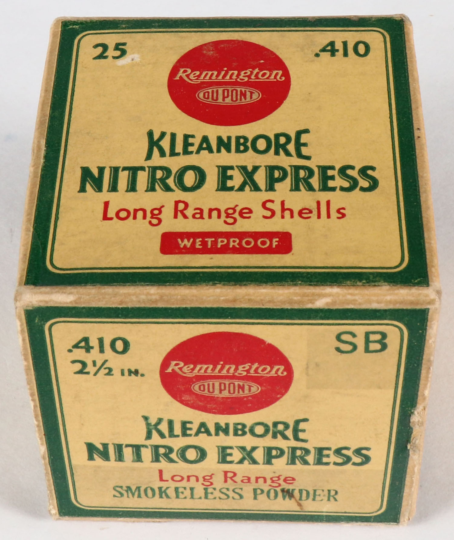 Remington, Kleanbore, NITRO EXPRESS, 410ga., 2 1/2'', 1pc., Full, shot size 1/5 Oz. BALL, box is buff, yellow, red and green, box has light scuffing with great colors, shells are excellent. Grade: Very Good ++ - Value: 20 to 60