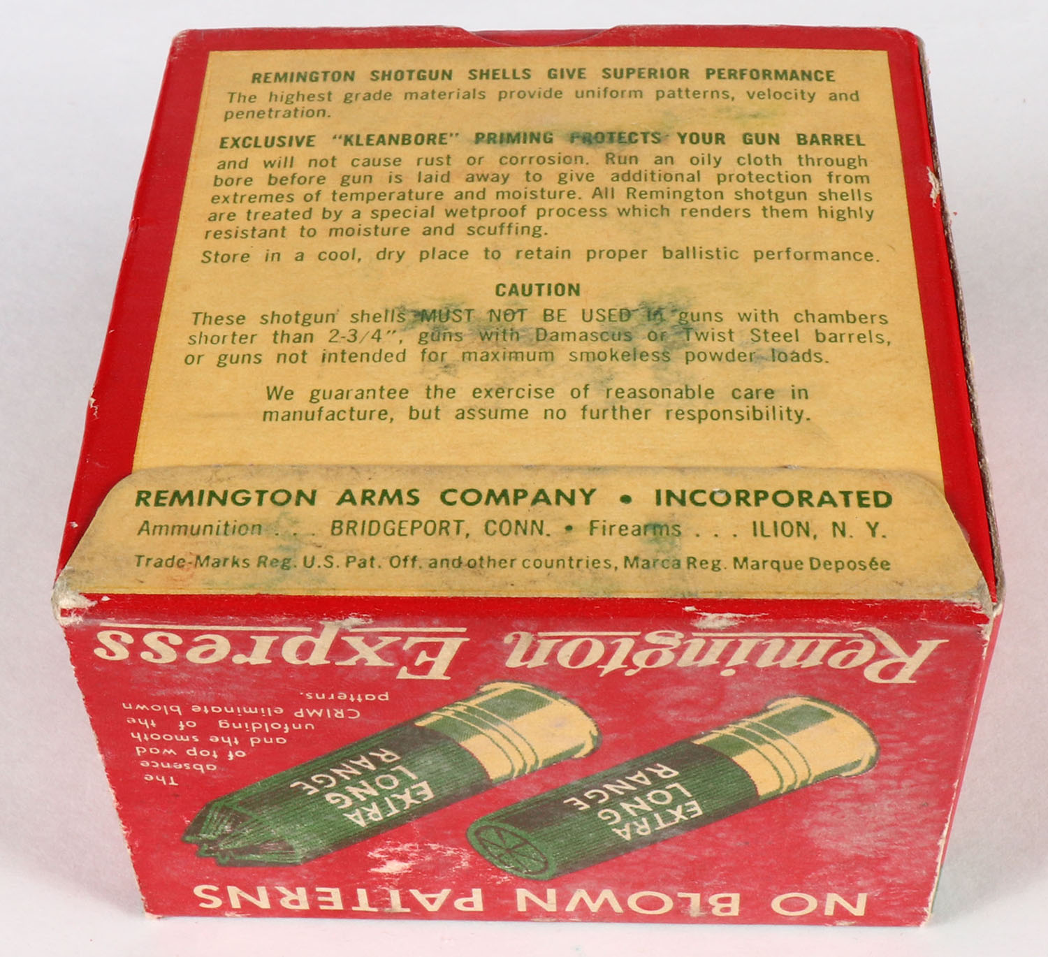 Remington Express, Extra Long Range, 16ga., 2 3/4'', 1pc., Full, shot size 4, box is red, green, and yellow, box is very solid, plastic shells are excellent. Grade: Excellent - Value: 10 to 30