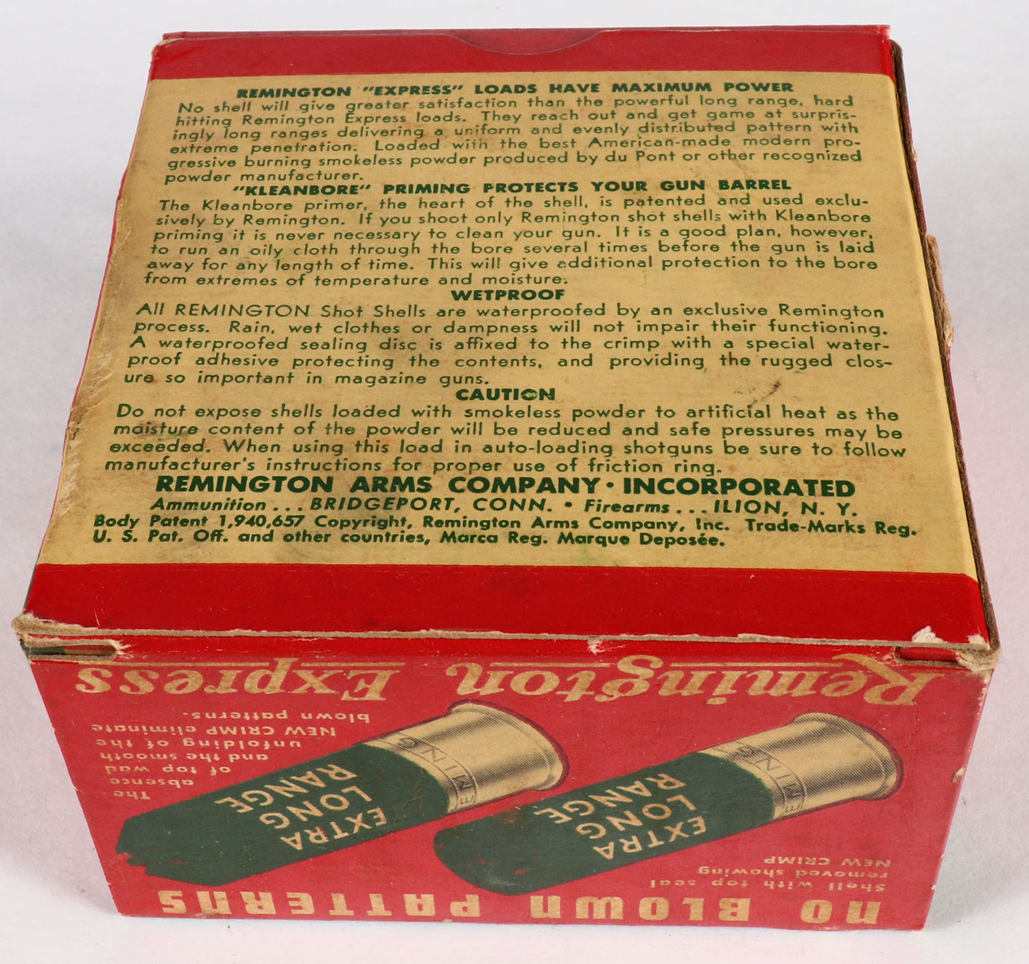 Remington Express, Extra Long Range, 12ga., 2 3/4'', 1pc., Full, shot size 5, box is white, yellow, red and green, box is very solid with very nice colors, shells are excellent. Grade: Excellent ++ - Value: 10 to 40