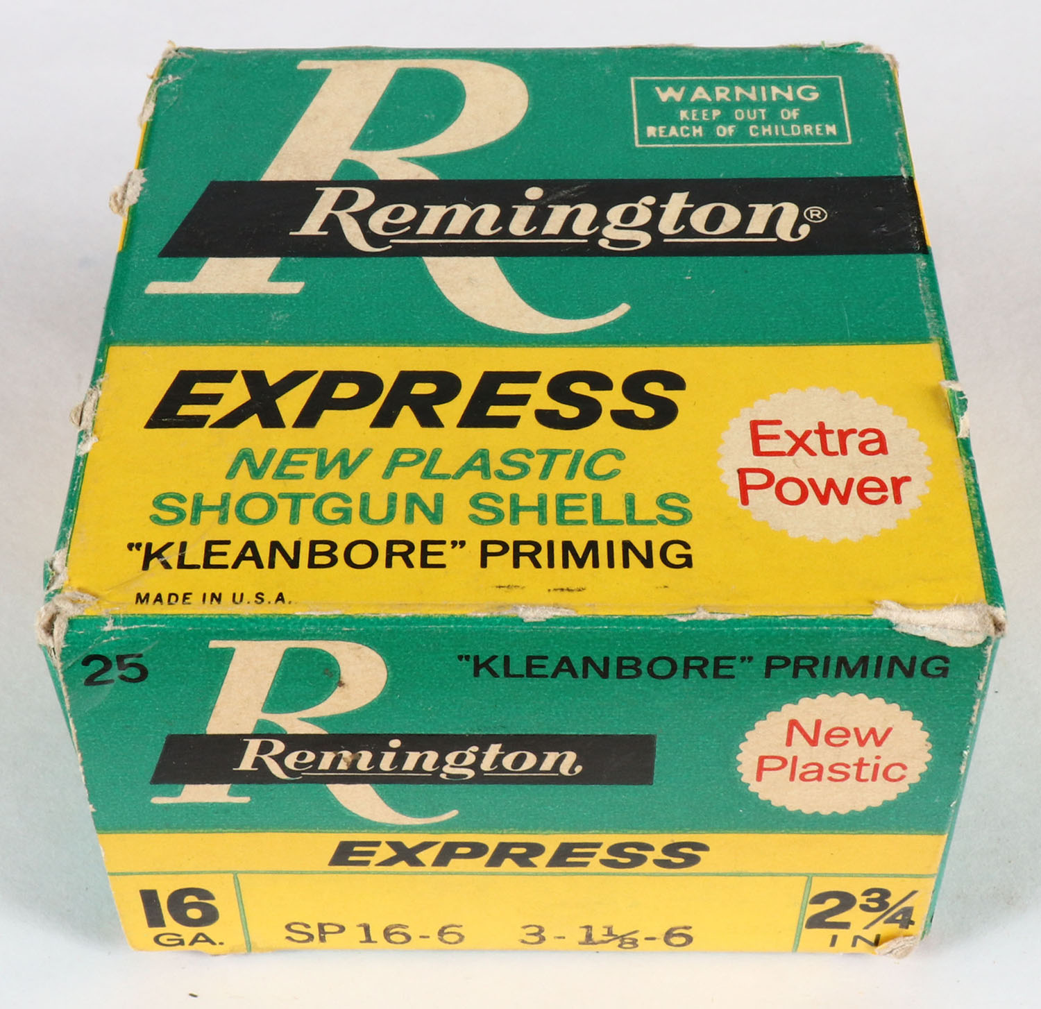 Remington, Express, 16ga., 1pc., Full with 11rds. being incorrect, shot size 6, multi-colored box, shells are good. Grade: Very Good - Value: 8 to 30