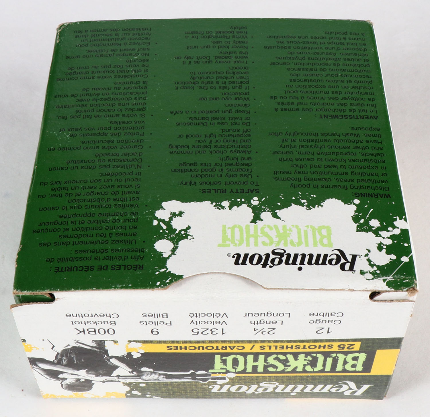 Remington, Buckshot, 12ga., 2 3/4'', 1pc., Full, shot size 00BK, multi-colored box, box is very solid with excellent colors, shells are excellent. Grade: Excellent + - Value: 10 to 30